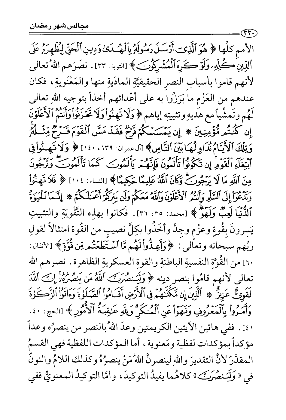 فكانوا بهذه التقوية والتثبيت يسيرون بقوة وعزم وجد وأخذوا بكل نصيب من القوة امتثالا لقول ربهم سبحانه وتعالى: {وَأَعِدُّوا لَهُمْ مَا اسْتَطَعْتُمْ مِنْ قُوَّةٍ} [الأنفال: 60] ، من القوة النفسية الباطنة والقوة العسكرية الظاهرة نصرهم الله تعالى لأنهم قاموا بنصر دينه {وَلَيَنْصُرَنَّ اللهُ مَنْ يَنْصُرُهُ إِنَّ اللهَ لَقَوِيٌّ عَزِيزٌ} {الَّذِينَ إِنْ مَكَّنَّاهُمْ فِي الْأَرْضِ أَقَامُوا الصَّلَاةَ وَآتَوُا الزَّكَاةَ وَأَمَرُوا بِالْمَعْرُوفِ وَنَهَوْا عَنِ الْمُنْكَرِ وَلِلَّهِ عَاقِبَةُ الْأُمُورِ} [الحج: 40 - 41] ، ففي هاتين الآيتين الكريمتين وعد الله بالنصر من ينصره وعدا مؤكدا بمؤكدات لفظية ومعنوية، أما المؤكدات اللفظية فهي القسم المقدَّر، لأن التقدير: والله لينصرن الله من ينصره، وكذلك اللام والنون في لينصرن كلاهما يفيد التوكيد، وأما التوكيد المعنوي ففي