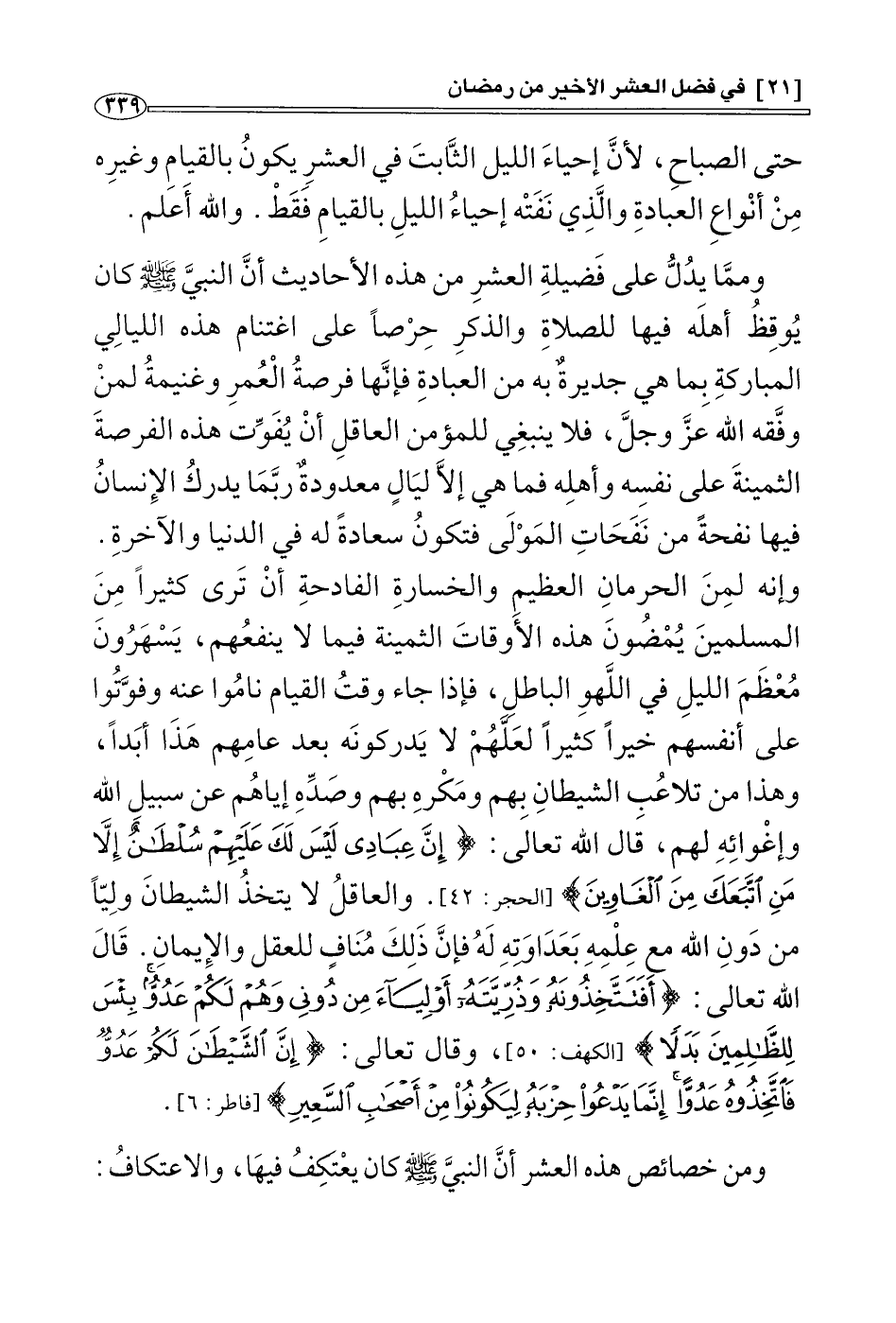 ومما يدل على فضيلة العشر من هذه الأحاديث أن النبي صَلَّى اللَّهُ عَلَيْهِ وَسَلَّمَ كان يوقظ أهله فيه للصلاة والذكر حرصا على اغتنام هذه الليالي المباركة بما هي جديرة به من العبادة، فإنها فرصة العمر وغنيمة لمن وفقه الله عز وجل، فلا ينبغي للمؤمن العاقل أن يفوت هذه الفرصة الثمينة على نفسه وأهله، فما هي إلا ليال معدودة ربما يدرك الإنسان فيها نفحة من نفحات المولى فتكون سعادة له في الدنيا والآخرة، وإنه لمن الحرمان العظيم والخسارة الفادحة أن ترى كثيرا من المسلمين يُمْضُون هذه الأوقات الثمينة فيما لا ينفعهم، يسهرون معظم الليل في اللهو الباطل , فإذا جاء وقت القيام ناموا عنه وفوَّتوا على أنفسهم خيرا كثيرا لعلهم لا يدركونه بعد عامهم هذا أبدا، وهذا من تلاعب الشيطان بهم ومكره بهم وصده إياهم عن سبيل الله وإغوائه لهم، قال الله تعالى: {إِنَّ عِبَادِي لَيْسَ لَكَ عَلَيْهِمْ سُلْطَانٌ إِلَّا مَنِ اتَّبَعَكَ مِنَ الْغَاوِينَ} [الحجر: 42] ، والعاقل لا يتخذ الشيطان وليا من دون الله مع علمه بعداوته له؛ فإن ذلك مناف للعقل والإيمان قال الله تعالى: {أَفَتَتَّخِذُونَهُ وَذُرِّيَّتَهُ أَوْلِيَاءَ مِنْ دُونِي