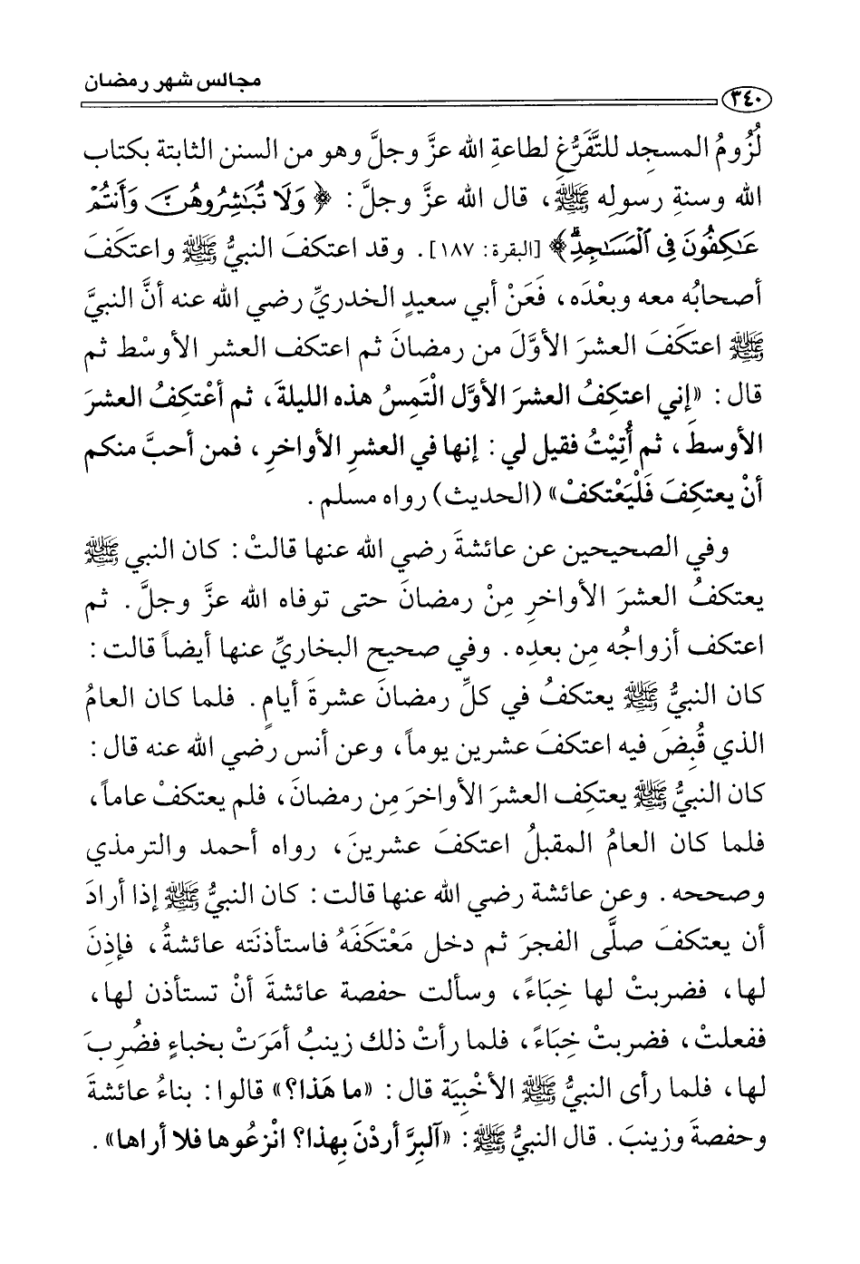 وعن عائشة رضي الله عنها قالت: «كان النبي صَلَّى اللَّهُ عَلَيْهِ وَسَلَّمَ يعتكف العشر الأواخر من رمضان حتى توفَّاه الله عز وجل ثم اعتكف أزواجه من بعده» (¬2) ، وعنها أيضا قالت: «كان النبي صَلَّى اللَّهُ عَلَيْهِ وَسَلَّمَ يعتكف في كل رمضان عشرة أيام، فلما كان العام الذي قُبِضَ فيه اعتكف عشرين يوما» (¬3) ، وعن أنس رضي الله عنه قال: «كان النبي صَلَّى اللَّهُ عَلَيْهِ وَسَلَّمَ يعتكف العشر الأواخر من رمضان فلم يعتكف عاما، فلما كان العام المقبل اعتكف عشرين» (¬4) ، وعن عائشة رضي الله عنها قالت: «كان النبي صَلَّى اللَّهُ عَلَيْهِ وَسَلَّمَ إذا أراد أن يعتكف صلى الفجر ثم دخل معتكفه فاستأذنته عائشة فأذن لها فضربت لها خِبَاء، وسألت حفصةُ عائشةَ أن تستأذن لها ففعلت فضربت خباء، فلما رأت ذلك زينب أمرت بخباء، فضُرِبَ لها، فلما رأى النبي صَلَّى اللَّهُ عَلَيْهِ وَسَلَّمَ الأخبية قال: " ما هذا؟ " قالوا: بناء عائشة وحفصة وزينب. فقال النبي صَلَّى اللَّهُ عَلَيْهِ وَسَلَّمَ: " آلْبِرَّ أردن بهذا؟ انزعوها فلا أراها "،