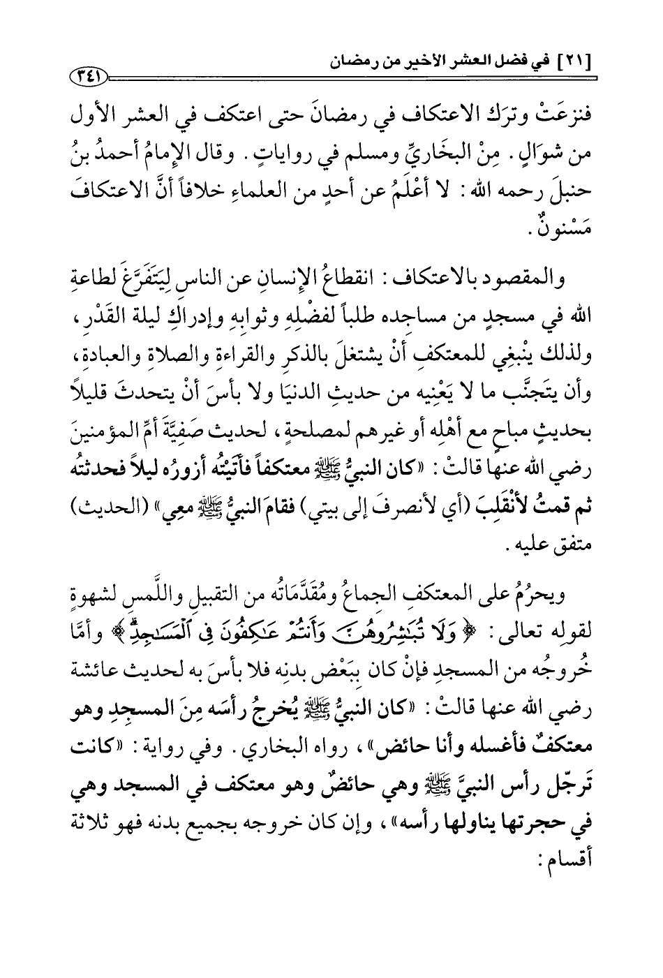 فنُزِعَتْ وترك الاعتكاف في رمضان حتى اعتكف في العشر الأول من شوال» (¬1) ، وقال الإمام أحمد بن حنبل رحمه الله: لا أعلم عن أحد من العلماء خلافا أن الاعتكاف مسنون.