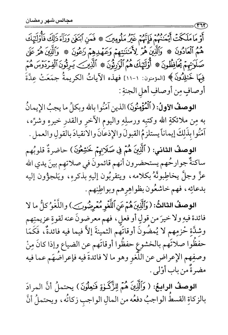 أوْ مَا مَلَكَتْ أَيْمَانُهُمْ فَإِنَّهُمْ غَيْرُ مَلُومِينَ} {فَمَنِ ابْتَغَى وَرَاءَ ذَلِكَ فَأُولَئِكَ هُمُ الْعَادُونَ} {وَالَّذِينَ هُمْ لِأَمَانَاتِهِمْ وَعَهْدِهِمْ رَاعُونَ} {وَالَّذِينَ هُمْ عَلَى صَلَوَاتِهِمْ يُحَافِظُونَ} {أُولَئِكَ هُمُ الْوَارِثُونَ} {الَّذِينَ يَرِثُونَ الْفِرْدَوْسَ هُمْ فِيهَا خَالِدُونَ} [المؤمنون: 1 - 11] ، فهذه الآيات الكريمة جمعت عدة أوصاف من أوصاف أهل الجنة.
