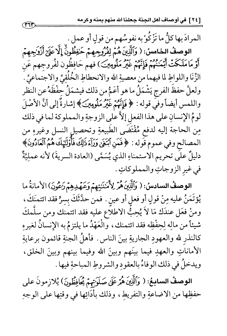 * الوصف الخامس: {وَالَّذِينَ هُمْ لِفُرُوجِهِمْ حَافِظُونَ} {إِلَّا عَلَى أَزْوَاجِهِمْ أوْ مَا مَلَكَتْ أَيْمَانُهُمْ فَإِنَّهُمْ غَيْرُ مَلُومِينَ} فهم حافظون لفروجهم عن الزنا واللواط لما فيهما من معصية الله والانحطاط الْخُلُقي والاجتماعي , ولعل حفظ الفرج يشمل ما هو أعم من ذلك فيشمل حفظه عن النظر واللمس أيضا، وفي قوله: {فَإِنَّهُمْ غَيْرُ مَلُومِينَ} إشارة إلى أن الأصل لوم الإنسان على هذا الفعل إلا على الزوجة والمملوكة لما في ذلك من الحاجة إليه؛ لدفع مقتضى الطبيعة وتحصيل النسل وغيره من المصالح , وفي عموم قوله: {فَمَنِ ابْتَغَى وَرَاءَ ذَلِكَ فَأُولَئِكَ هُمُ الْعَادُونَ} دليل على تحريم الاستمناء الذي يسمى [العادة السرية] لأنه عملية في غير الزوجات والمملوكات.