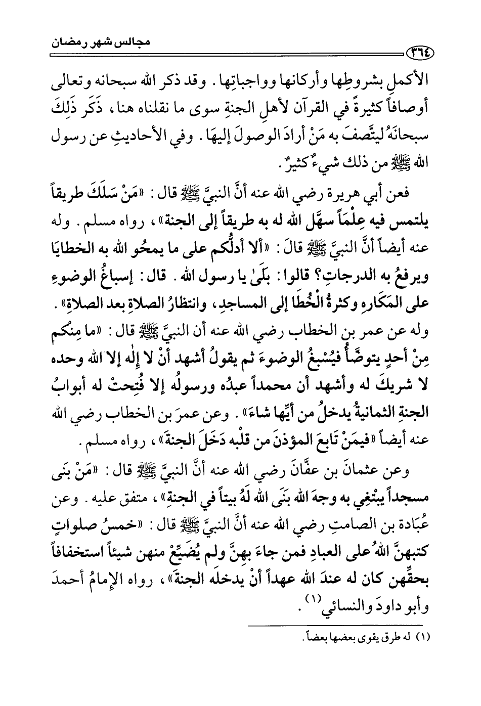 وقد ذكر الله سبحانه وتعالى أوصافا كثيرة في القرآن لأهل الجنة سوى ما نقلناه هنا، ذكر ذلك سبحانه ليتصف به من أراد الوصول إليها، وفي الأحاديث عن رسول الله صَلَّى اللَّهُ عَلَيْهِ وَسَلَّمَ من ذلك شيء كثير: فعن أبي هريرة رضي الله عنه أن النبي صَلَّى اللَّهُ عَلَيْهِ وَسَلَّمَ قال: «من سلك طريقا يلتمس فيه علما سَهَّلَ الله له به طريقا إلى الجنة» (¬1) . وعنه أيضا أن النبي صَلَّى اللَّهُ عَلَيْهِ وَسَلَّمَ قال: «ألا أدلكم على ما يمحو الله به الخطايا ويرفع به الدرجات؟ " قالوا: بلى يا رسول الله. قال: " إسباغ الوضوء على المكاره وكثرة الْخُطَا إلى المساجد وانتظار الصلاة بعد الصلاة» (¬2) . وعن عمر بن الخطاب رضي الله عنه أن النبي صَلَّى اللَّهُ عَلَيْهِ وَسَلَّمَ قال: «ما منكم من أحد يتوضأ فيسبغ الوضوء ثم يقول: أشهد أن لا إله إلا الله وحده لا شريك له وأشهد أن محمدا عبده ورسوله إلا فُتِحَت له أبواب الجنة الثمانية يدخل من أيها شاء» (¬3) ، وعن عمر بن الخطاب رضي الله عنه أيضا «فيمن تابع المؤذن من قلبه دخل الجنة» (¬4) .