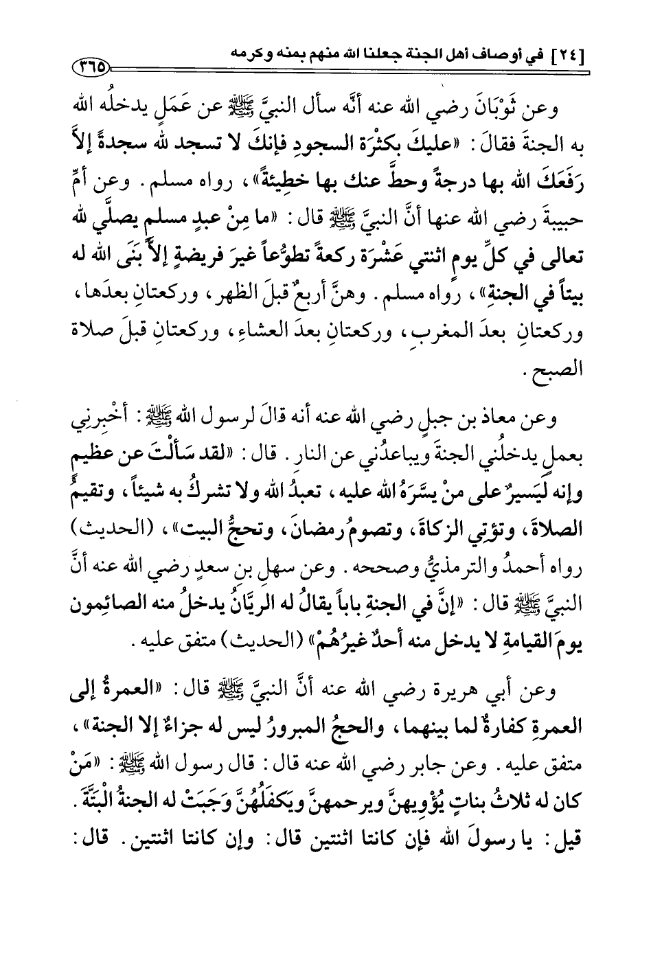 وعن معاذ بن جبل رضي الله عنه أنه قال لرسول الله صَلَّى اللَّهُ عَلَيْهِ وَسَلَّمَ: «أخبرني بعمل يدخلني الجنة ويباعدني عن النار قال: " لقد سألت عن عظيم وإنه ليسير على من يسره الله عليه: تعبد الله ولا تشرك به شيئا، وتقيم الصلاة، وتؤتي الزكاة، وتصوم رمضان، وتحج البيت» (¬3) ، وعن سهل بن سعد رضي الله عنه «أن النبي صَلَّى اللَّهُ عَلَيْهِ وَسَلَّمَ قال: " إن في الجنة بابا يقال له الريان يدخل منه الصائمون يوم القيامة لا يدخل منه أحد غيرهم» متفق عليه. وعن أبى هريرة رضي الله عنه «أن النبي صَلَّى اللَّهُ عَلَيْهِ وَسَلَّمَ قال: " العمرة إلى العمرة كفارة لما بينهما والحج المبرور ليس له جزاء إلا الجنة» (¬4) .
