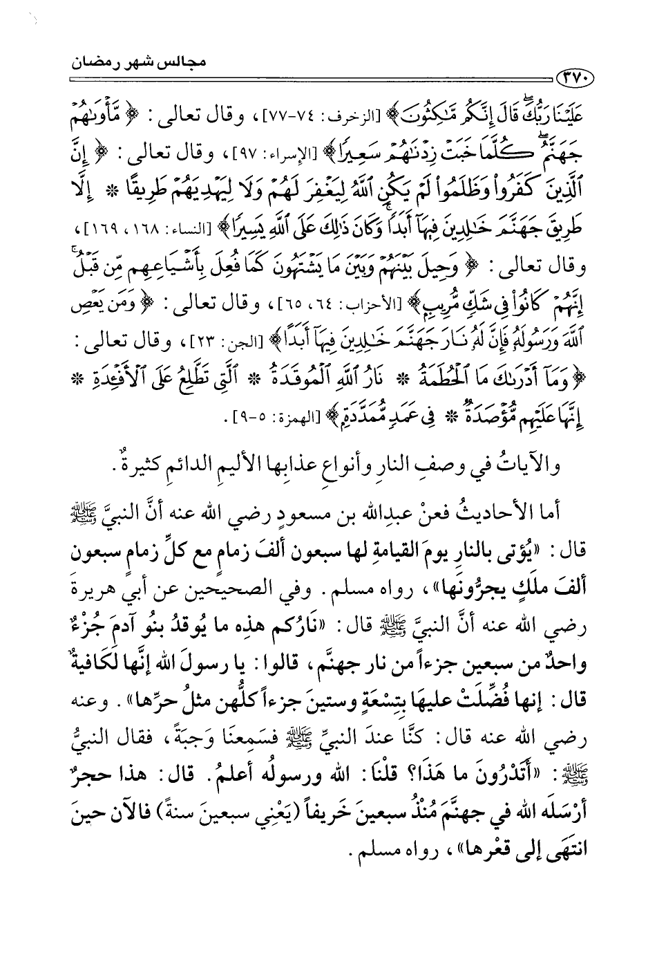 أما الأحاديث فعن عبد الله بن مسعود رضي الله عنه أن النبي صَلَّى اللَّهُ عَلَيْهِ وَسَلَّمَ قال: «يؤتى بالنار يوم القيامة لها سبعون ألف زمام، مع كل زمام سبعون ألف مَلَك يجرونها» (¬1) ، وعن أبي هريرة رضي الله عنه أن النبي صَلَّى اللَّهُ عَلَيْهِ وَسَلَّمَ قال: «ناركم هذه ما يُوقد بنو آدم جزء واحد من سبعين جزءا من نار جهنم "، قالوا: يا رسول الله إنها لكافية؟ قال: " إنها فُضِّلَت عليها بتسعة وستين جزءا كلهن مثل حرها» (¬2) ، وعنه رضي الله عنه قال: «كنا عند النبي صَلَّى اللَّهُ عَلَيْهِ وَسَلَّمَ فسمعنا وَجْبَة فقال النبي صَلَّى اللَّهُ عَلَيْهِ وَسَلَّمَ: " أتدرون ما هذا؟ " قلنا: الله ورسوله أعلم. قال: " هذا حجر أرسله الله في جهنم منذ سبعين خريفا (يعني سبعين سنة) فالآن حين انتهى إلى قعرها» (¬3) .
