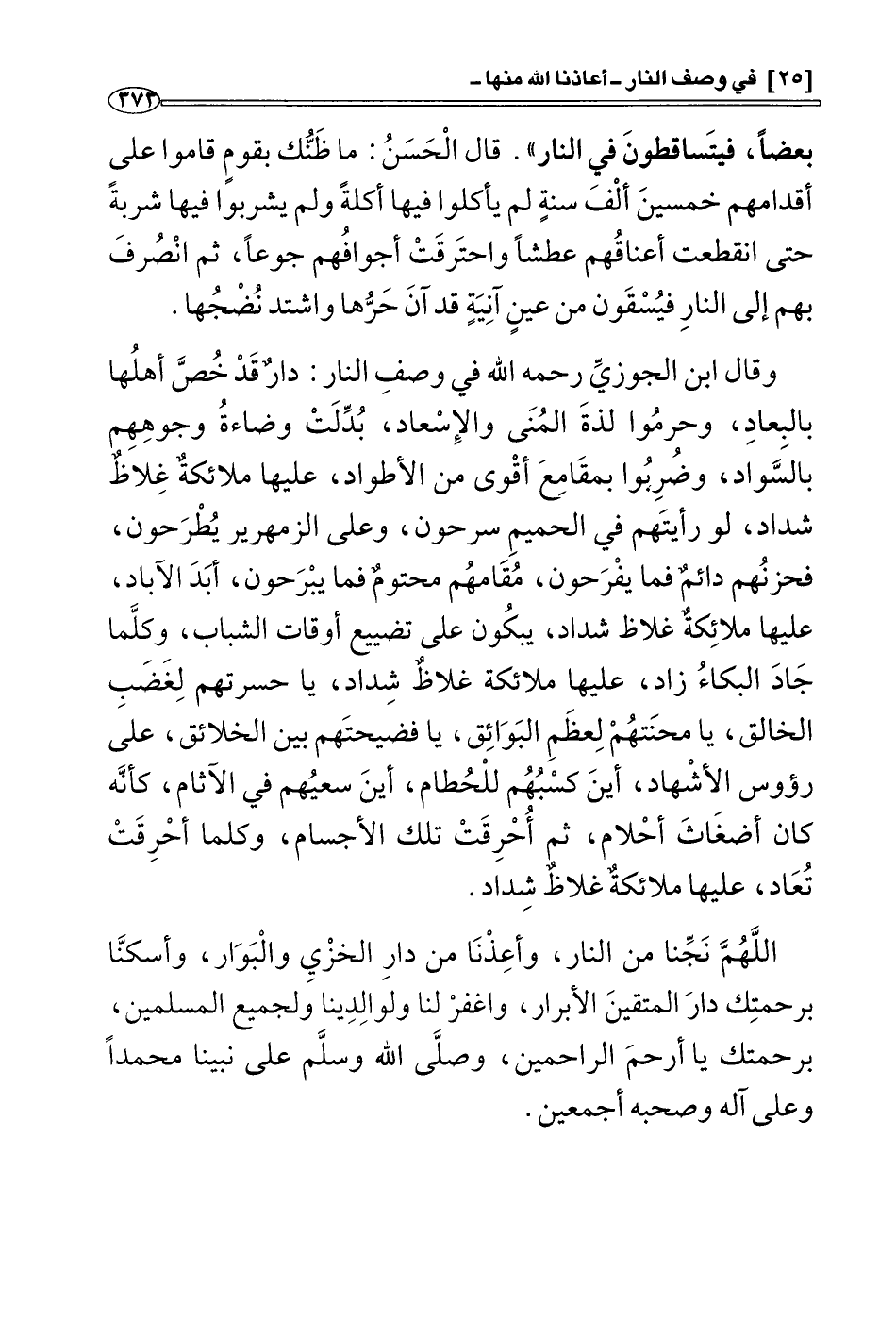 وقال ابن الجوزي رحمه الله في وصف النار: دار قد خُصَّ أهلها بالبعاد، وحُرِموا لذة المنى والإسعاد، بُدِّلَت وضاءة وجوههم بالسواد، وضُرِبُوا بمقامع أقوى من الأطواد، عليها ملائكة غلاط شداد، لو رأيتهم في الحميم يسرحون، وعلى الزمهرير يُطْرَحون، فحزنهم دائم فما يفرحون، مُقَامهم محتوم فما يبرحون أبد الآباد، عليها ملائكة غلاط شداد، توبيخهم أعظم من العذاب، تأسُّفهم أقوى من الْمُصاب، يبكون على تضييع أوقات الشباب، وكلما جاد البكاء زاد، عليها ملائكة غلاظ شداد، يا حسرتهم لغضب الخالق، يا محنتهم لعِظَم البوائق، يا فضيحتهم بين الخلائق، على رؤوس الأشهاد، أين كسبهم للحُطام؟ أين سعيهم في الآثام؟ كأنه كان أضغاث أحلام، ثم أُحْرِقت تلك الأجسام، وكلما أُحْرِقت تُعَاد، عليها ملائكة غلاظ شداد.