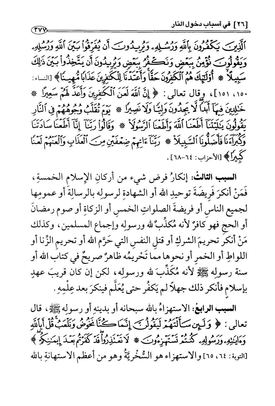 * السبب الثالث: إنكار فرض شيء من أركان الإسلام الخمسة , فَمَنْ أنكر فرضِيَّة توحيد الله أو الشهادة لرسوله بالرسالة أو عمومها لجميع الناس أو فريضة الصلوات الخمس أو الزكاة أو صوم رمضان أو الحج، فهو كافر لأنه مكذِّب لله ورسوله وإجماع المسلمين، وكذلك من أنكر تحريم الشرك أو قتل النفس التي حرم الله أو تحريم الزنا أو اللواط أو الخمر أو نحوها مما تحريمه ظاهر صريح في كتاب الله أو سنة رسوله صَلَّى اللَّهُ عَلَيْهِ وَسَلَّمَ؛ لأنه مكذِّب لله ورسوله، لكن إن كان قريب عهد بإسلام فأنكر ذلك جهلا لم يَكْفُر حتى يُعَلَّم فينكر بعد علمه.