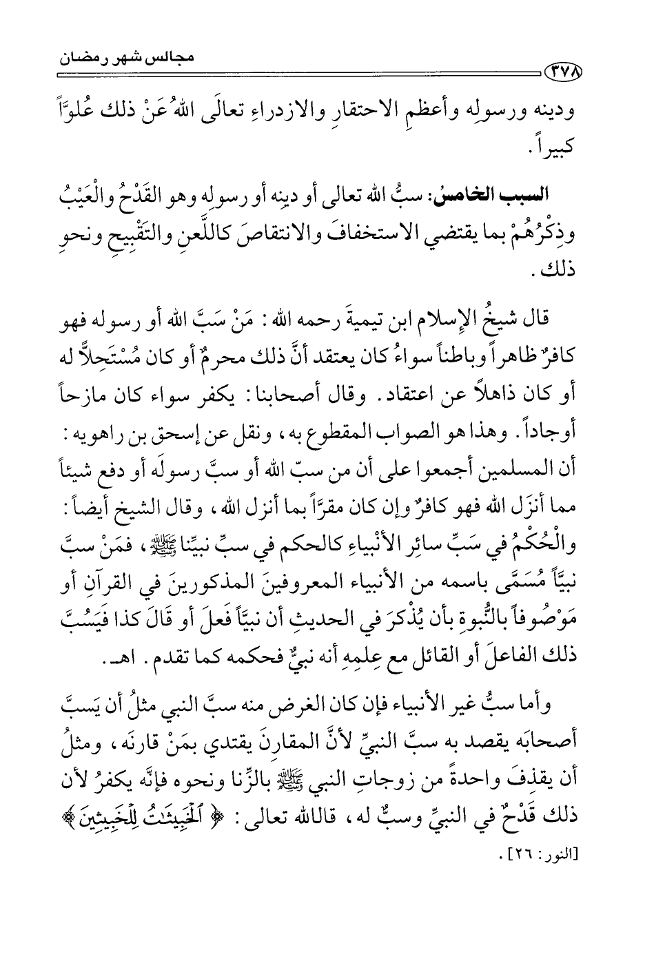 * السبب الخامس: سب الله تعالى أو دينه أو رسوله، وهو القدْح والعيب وذكرهم بما يقتضي الاستخفاف والانتقاص كاللعن والتقبيح ونحو ذلك.