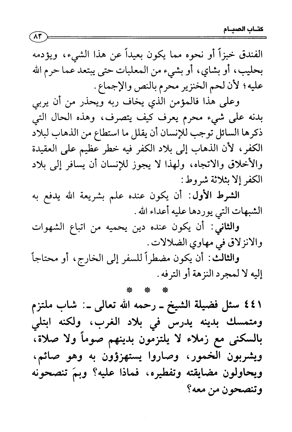 وعلى هذا فالمؤمن الذي يخاف ربه ويحذر من أن يربي بدنه على شيء محرم يعرف كيف يتصرف، وهذه الحال التي ذكرها السائل توجب للإنسان أن يقلل ما استطاع من الذهاب لبلاد الكفر، لأن الذهاب إلى بلاد الكفر فيه خطر عظيم على العقيدة والأخلاق والاتجاه، ولهذا لا يجوز للإنسان أن يسافر إلى بلاد الكفر إلا بثلاثة شروط: