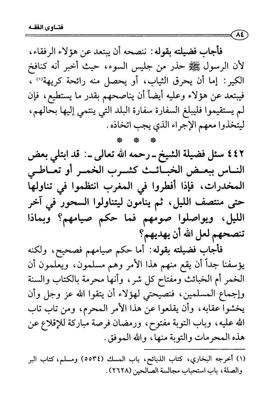 فأجاب فضيلته بقوله: ننصحه أن يبتعد عن هؤلاء الرفقاء، لأن الرسول صَلَّى اللَّهُ عَلَيْهِ وَسَلَّمَ حذر من جليس السوء، حيث أخبر أنه كنافخ الكير: إما أن يحرق الثياب، أو يحصل منه رائحة كريهة، فيبتعد عن هؤلاء وعليه أيضاً أن يناصحهم بقدر ما يستطيع، فإن لم يستقيموا فليبلغ السفارة سفارة البلد التي ينتمي إليها بحالهم، ليتخذوا معهم الإجراء الذي يجب اتخاذه.