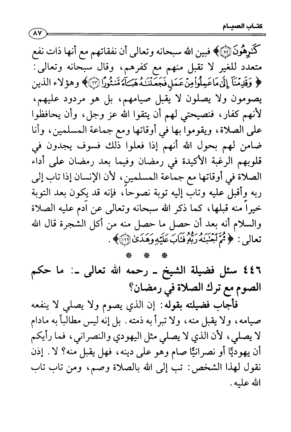 كَارِهُونَ كَارِهُونَ} فبين الله سبحانه وتعالى أن نفقاتهم مع أنها ذات نفع متعدد للغير لا تقبل منهم مع كفرهم، وقال سبحانه وتعالى: {وَقَدِمْنَآ إِلَى مَا عَمِلُواْ مِنْ عَمَلٍ فَجَعَلْنَاهُ هَبَآءً مَّنثُوراً} وهؤلاء الذين يصومون ولا يصلون لا يقبل صيامهم، بل هو مردود عليهم، لأنهم كفار، فنصيحتي لهم أن يتقوا الله عز وجل، وأن يحافظوا على الصلاة، ويقوموا بها في أوقاتها ومع جماعة المسلمين، وأنا ضامن لهم بحول الله أنهم إذا فعلوا ذلك فسوف يجدون في قلوبهم الرغبة الأكيدة في رمضان وفيما بعد رمضان على أداء الصلاة في أوقاتها مع جماعة المسلمين، لأن الإنسان إذا تاب إلى ربه وأقبل عليه وتاب إليه توبة نصوحاً، فإنه قد يكون بعد التوبة خيراً منه قبلها، كما ذكر الله سبحانه وتعالى عن آدم عليه الصلاة والسلام أنه بعد أن حصل ما حصل منه من أكل الشجرة قال الله تعالى: {ثُمَّ اجْتَبَاهُ رَبُّهُ فَتَابَ عَلَيْهِ وَهَدَى} .
