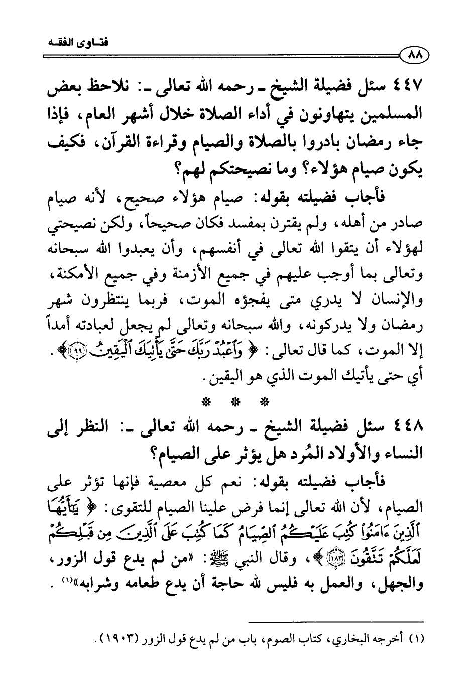 فأجاب فضيلته بقوله: نعم كل معصية فإنها تؤثر على الصيام، لأن الله تعالى إنما فرض علينا الصيام للتقوى: {ياأَيُّهَا الَّذِينَءَامَنُواْ كُتِبَ عَلَيْكُمُ الصِّيَامُ كَمَا كُتِبَ عَلَى الَّذِينَ مِن قَبْلِكُمْ لَعَلَّكُمْ تَتَّقُونَ} ، وقال النبي صَلَّى اللَّهُ عَلَيْهِ وَسَلَّمَ: «من لم يدع قول الزور، والجهل، والعمل به فليس لله حاجة أن يدع طعامه وشرابه» .