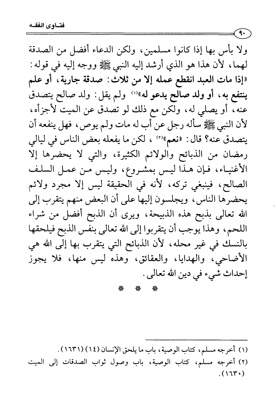 ولا بأس بها إذا كانوا مسلمين، ولكن الدعاء أفضل من الصدقة لهما، لأن هذا هو الذي أرشد إليه النبي صَلَّى اللَّهُ عَلَيْهِ وَسَلَّمَ ووجه إليه في قوله: «إذا مات العبد انقطع عمله إلا من ثلاث: صدقة جارية، أو علم ينتفع به، أو ولد صالح يدعو له» ولم يقل: ولد صالح يتصدق عنه، أو يصلي له، ولكن مع ذلك لو تصدق عن الميت لأجزأه، لأن النبي صَلَّى اللَّهُ عَلَيْهِ وَسَلَّمَ سأله رجل عن أب له مات ولم يوص، فهل ينفعه أن يتصدق عنه؟ قال: «نعم» ، لكن ما يفعله بعض الناس في ليالي رمضان من الذبائح والولائم الكثيرة، والتي لا يحضرها إلا الأغنياء، فإن هذا ليس بمشروع، وليس من عمل السلف الصالح، فينبغي تركه، لأنه في الحقيقة ليس إلا مجرد ولائم يحضرها الناس، ويجلسون إليها على أن البعض منهم يتقرب إلى الله تعالى بذبح هذه الذبيحة، ويرى أن الذبح أفضل من شراء اللحم، وهذا يوجب أن يتقربوا إلى الله تعالى بنفس الذبح فيلحقها بالنسك في غير محله، لأن الذبائح التي يتقرب بها إلى الله هي الأضاحي، والهدايا، والعقائق، وهذه ليس منها، فلا يجوز إحداث شيء في دين الله تعالى.