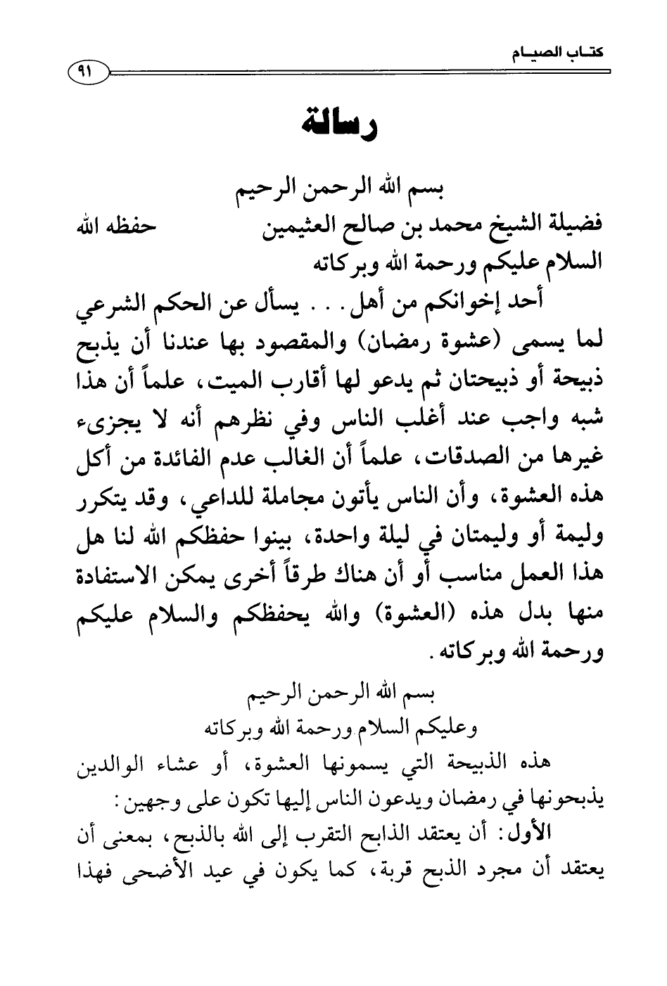 هذه الذبيحة التي يسمونها العشوة، أو عشاء الوالدين يذبحونها في رمضان ويدعون الناس إليها تكون على وجهين:
