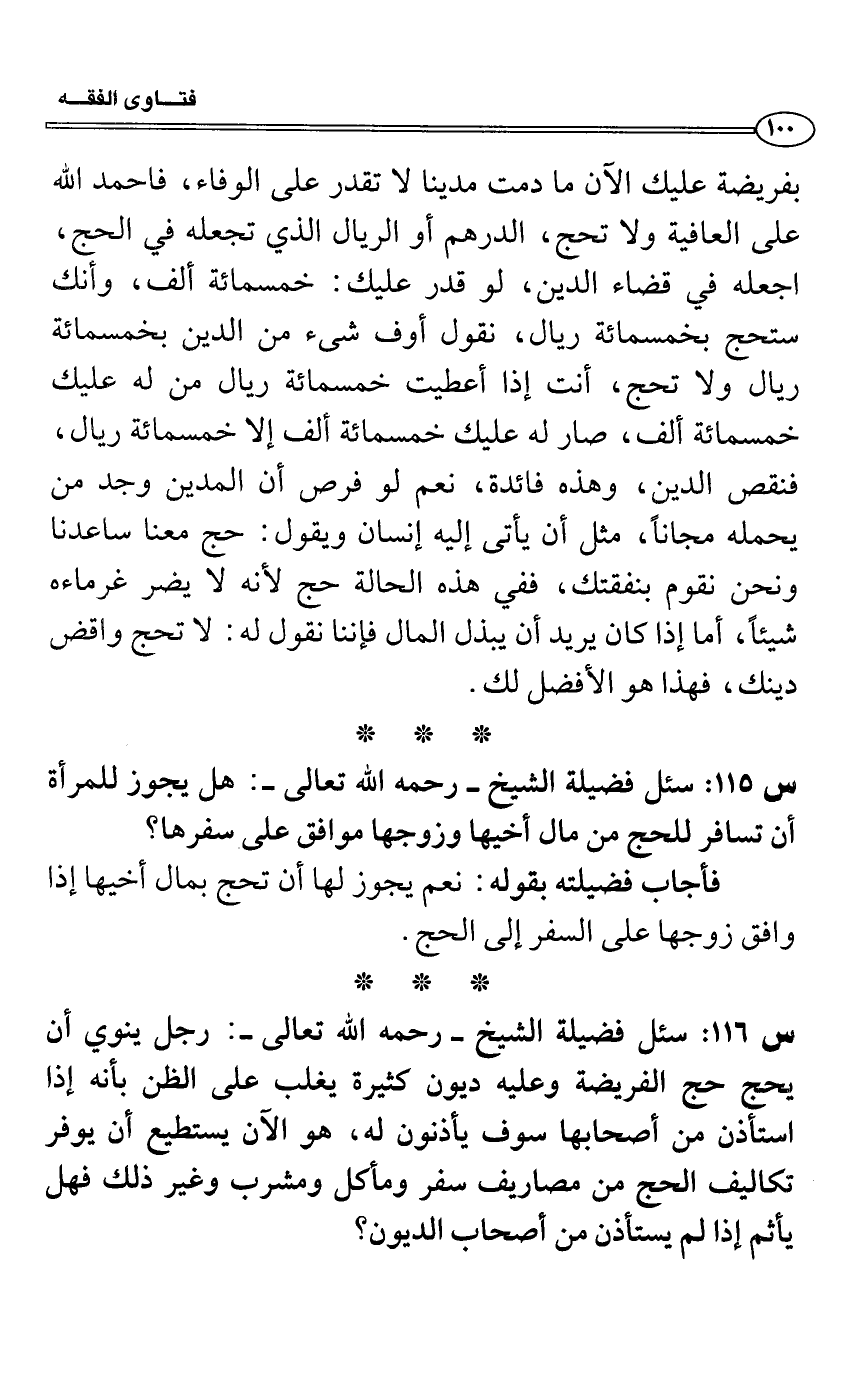 س 116: سئل فضيلة الشيخ- رحمه الله تعالى-: رجل ينوي أن يحج حج الفريضة وعليه ديون كثيرة يغلب على الظن بأنه إذا استأذن من أصحابها سوف يأذنون له، هو الآن يستطيع أن يوفر