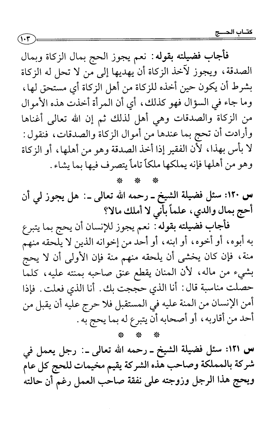س 121: سئل فضيلة الشيخ- رحمه الله تعالى-: رجل يعمل في شركة بالمملكة وصاحب هذه الشركة يقيم مخيمات للحج كل عام ويحج هذا الرجل وزوجته على نفقة صاحب العمل رغم أن حالته