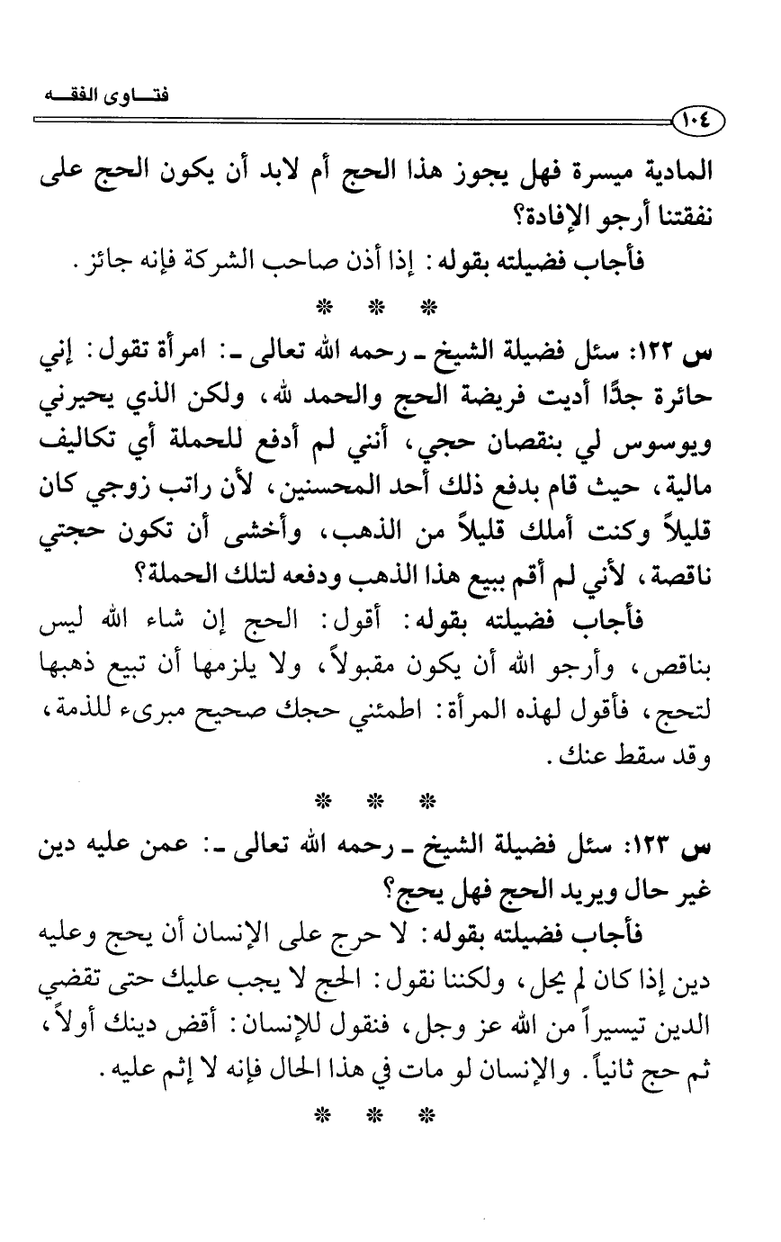 س 123: سئل فضيلة الشيخ- رحمه الله تعالى-: عمن عليه دين غير حال ويريد الحج فهل يحج؟