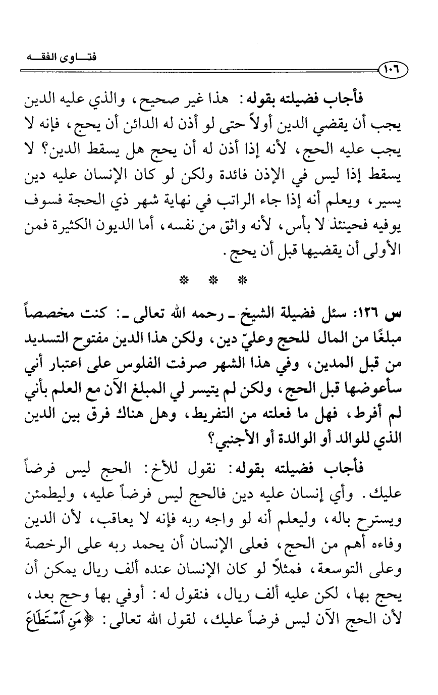 س 126: سئل فضيلة الشيخ- رحمه الله تعالى-: كنت مخصصاً مبلغًا من المال للحج وعليّ دين، ولكن هذا الدين مفتوح التسديد من قبل المدين، وفي هذا الشهر صرفت الفلوس على اعتبار أني