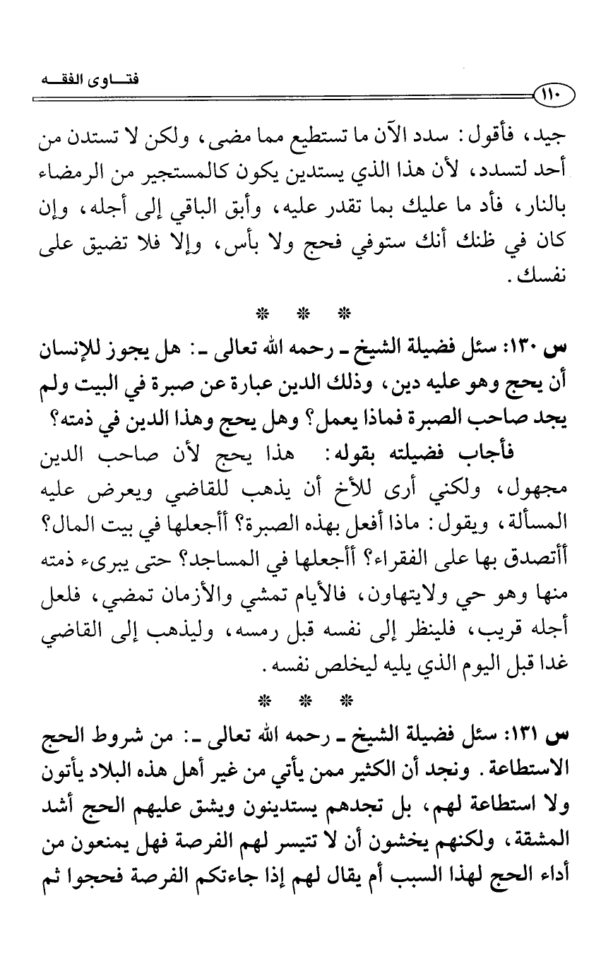س 130: سئل فضيلة الشيخ- رحمه الله تعالى-: هل يجوز للإنسان أن يحج وهو عليه دين، وذلك الدين عبارة عن صبرة في البيت ولم يجد صاحب الصبرة فماذا يعمل؟ وهل يحج وهذا الدين في ذمته؟