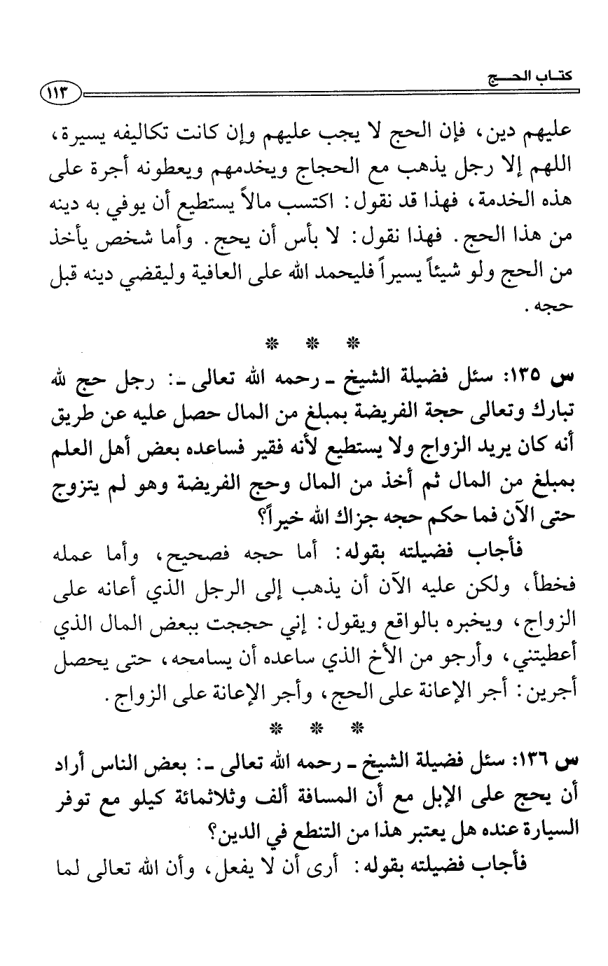 س 135: سئل فضيلة الشيخ- رحمه الله تعالى-: رجل حج لله تبارك وتعالى حجة الفريضة بمبلغ من المال حصل عليه عن طريق أنه كان يريد الزواج ولا يستطيع لأنه فقير فساعده بعض أهل العلم