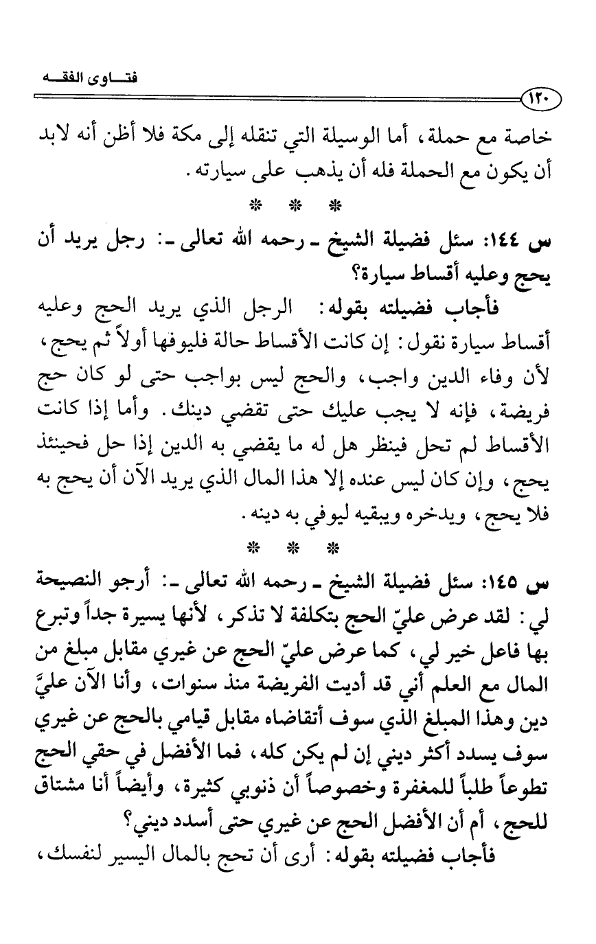 س 144: سئل فضيلة الشيخ- رحمه الله تعالى-: رجل يريد أن يحج وعليه أقساط سيارة؟