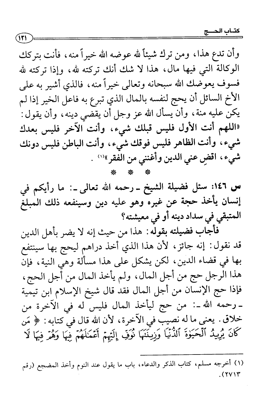 س 146: سئل فضيلة الشيخ- رحمه الله تعالى-: ما رأيكم في إنسان يأخذ حجة عن غيره وهو عليه دين وسينفعه ذلك المبلغ المتبقي في سداد دينه أو في معيشته؟