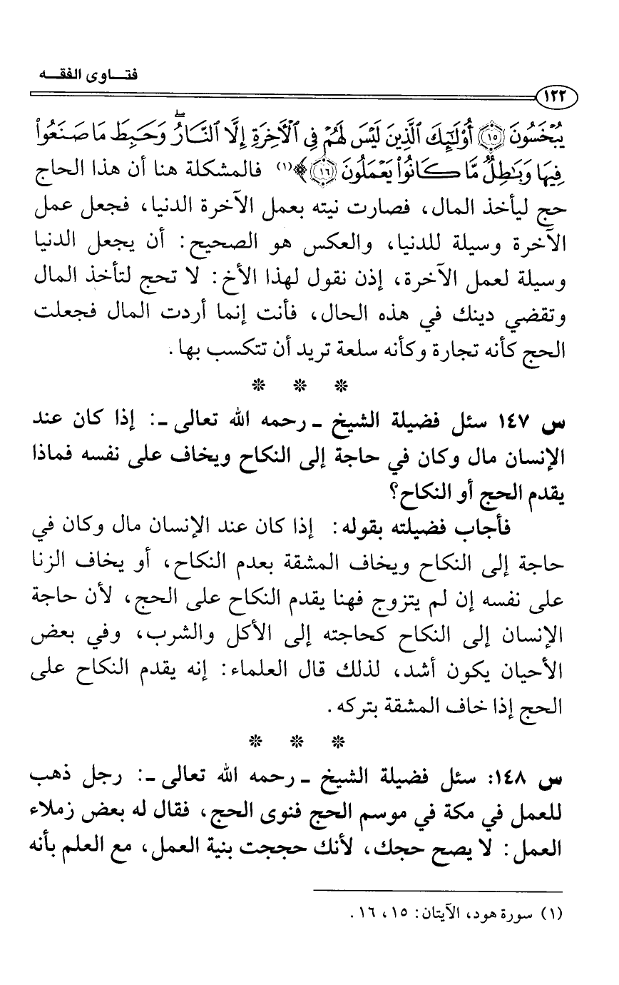 يُبْخَسُونَ (15) أُولَئِكَ الَّذِينَ لَيْسَ لَهُمْ فِي الْآَخِرَةِ إِلَّا النَّارُ وَحَبِطَ مَا صَنَعُوا فِيهَا وَبَاطِلٌ مَا كَانُوا يَعْمَلُونَ (16) (1) فالمشكلة هنا أن هذا الحاج حجِ ليأخذ المال، فصارت نيته بعمل الآخرة الدنيا، فجعل عمل الآخرة وسيلة للدنيا، والعكس هو الصحيح: أن يجعل الدنيا وسيلة لعمل الآخرة، إذن نقول لهذا الأخ: لا تحج لتأخذ المال وتقضي دينك في هذه الحال، فأنت إنما أردت المال فجعلت