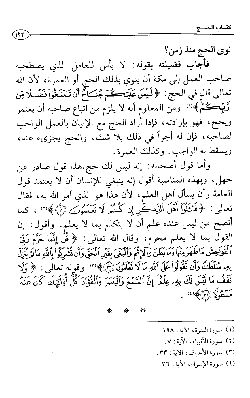 تعالى: (فَاسْأَلُوا أَهْلَ الذِّكْرِ إِنْ كُنْتُمْ لَا تَعْلَمُونَ (7)) (2) ، كما أنصح من ليس عنده علم أن لا يتكلم بما لا يعلم، وأقول: إن القول بما لا يعلمِ محرم، وقال الله تعالى: (قُلْ إِنَّمَا حَرَّمَ رَبِّيَ الْفَوَاحِشَ مَا ظَهَرَ مِنْهَا وَمَا بَطَنَ وَالْإِثْمَ وَالْبَغْيَ بِغَيْرِ الْحَقِّ وَأَنْ تُشْرِكُوا بِاللَّهِ مَا لَمْ يُنَزِّلْ بِهِ سُلْطَانًا وَأَنْ تَقُولُوا عَلَى اللَّهِ مَا لَا تَعْلَمُونَ (33)) (3) وقوله تعالى: (وَلَا تَقْفُ مَا لَيْسَ لَكَ بِهِ عِلْمٌ إِنَّ السَّمْعَ وَالْبَصَرَ وَالْفُؤَادَ كُلُّ أُولَئِكَ كَانَ عَنْهُ مَسْئُولًا (36)) (4) .