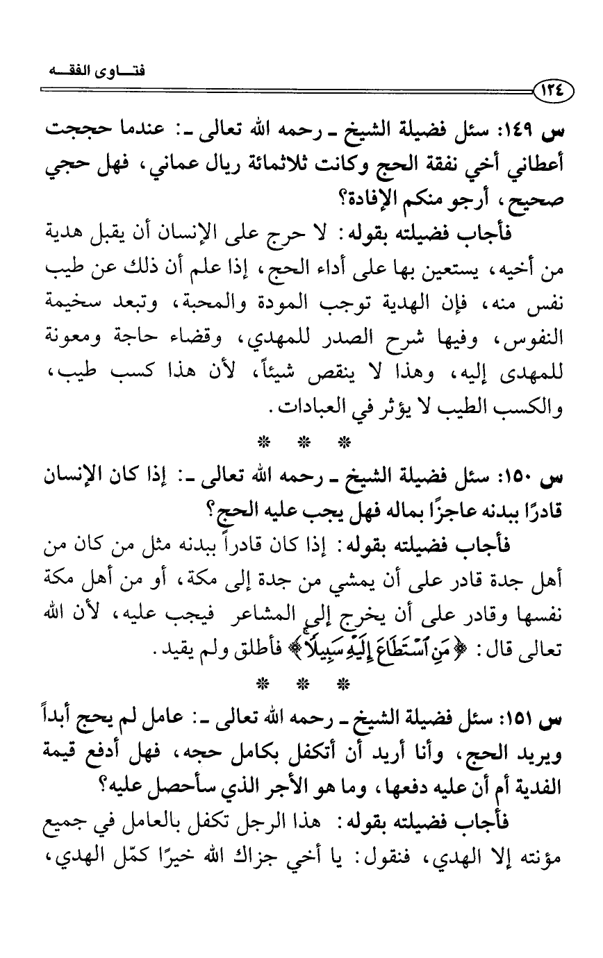 س 151: سئل فضيلة الشيخ- رحمه الله تعالى-: عامل لم يحج أبداً ويريد الحج، وأنا أريد أن أتكفل بكامل حجه، فهل أدفع قيمة الفدية أم أن عليه دفعها، وما هو الأجر الذي سأحصل عليه؟