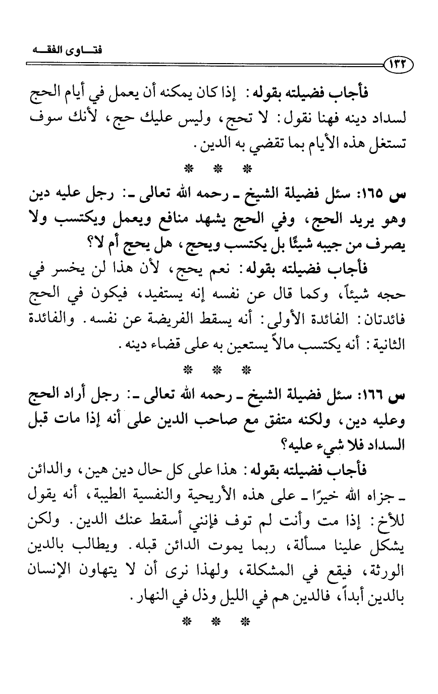 س 165: سئل فضيلة الشيخ- رحمه الله تعالى-: رجل عليه دين وهو يريد الحج، وفي الحج يشهد منافع ويعمل ويكتسب ولا يصرف من جيبه شيئاً بل يكتسب ويحج، هل يحج أم لا؟