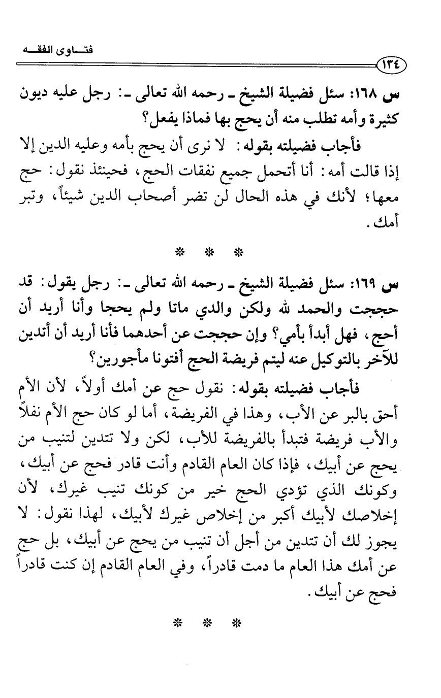 س 168: سئل فضيلة الشيخ- رحمه الله تعالى-: رجل عليه ديون كثيرة وأمه تطلب منه أن يحج بها فماذا يفعل؟