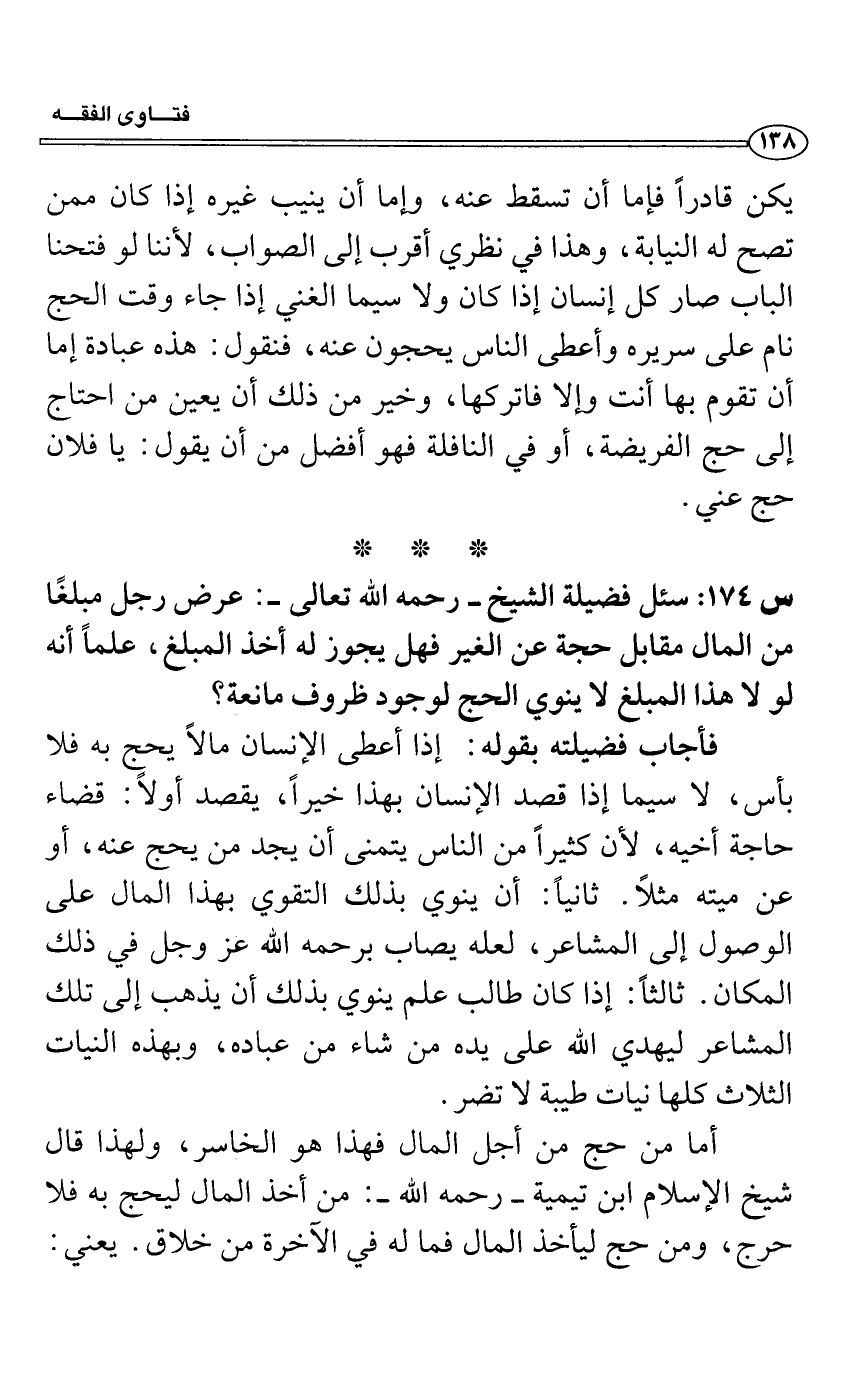س 174: سئل فضيلة الشيخ- رحمه الله تعالى-: عرض رجل مبلغًا من المال مقابل حجة عن الغير فهل يجوز له أخذ المبلغ، علماً أنه لولا هذا المبلغ لا ينوي الحج لوجود ظروف مانعة؟
