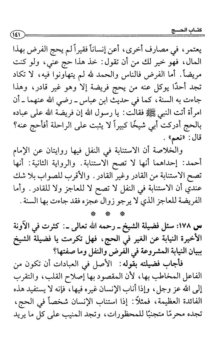 س 178: سئل فضيلة الشيخ- رحمه الله تعالى-: كثرت في الآونة الأخيرة النيابة عن الغير في الحج، فهل تكرمت يا فضيلة الشيخ ببيان النيابة المشروعة في الفرض والنفل وما صفتها؟