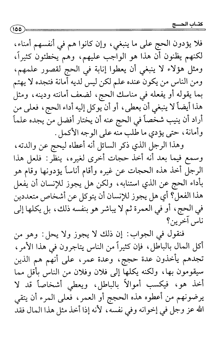 فلا يؤدون الحج على ما ينبغي، وإن كانوا هم في أنفسهم أمناء، لكنهم يظنون أن هذا هو الواجب عليهم، وهم يخطئون كثيراً، ومثل هؤلاء لا ينبغي أن يعطوا إنابة في الحج لقصور علمهم، ومن الناس من يكون عنده علم لكن ليس لديه أمانة فتجده لا يهتم بما يقوله أو يفعله في مناسك الحج، لضعف أمانته ودينه، ومثل هذا أيضا لا ينبغي أن يعطى، أو أن يوكل إليه أداء الحج، فعلى من