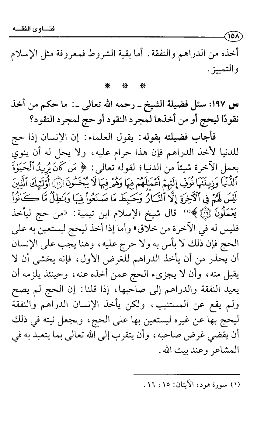 س 197: سئل فضيلة الشيخ- رحمه الله تعالى-: ما حكم من أخذ نقودًا ليحج أو من أخذها لمجرد النقود أو حج لمجرد النقود؟
