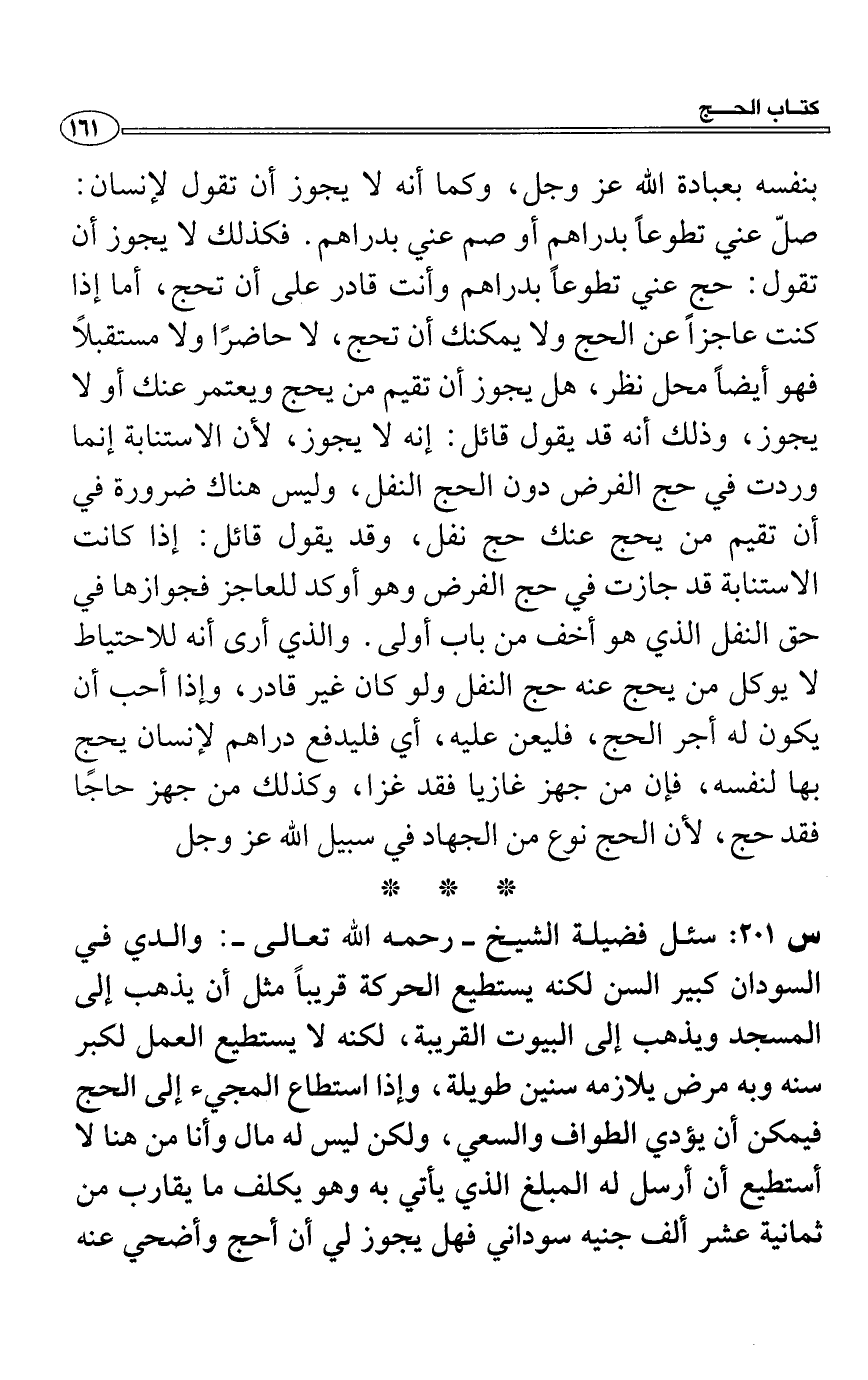 بنفسه بعبادة الله عز وجل، وكما أنه لا يجوز أن تقول لإنسان: صلّ عني تطوعاً بدراهم أو صم عني بدراهم. فكذلك لا يجوز أن تقول: حج عني تطوعاً بدراهم وأنت قادر على أن تحج، أما إذا