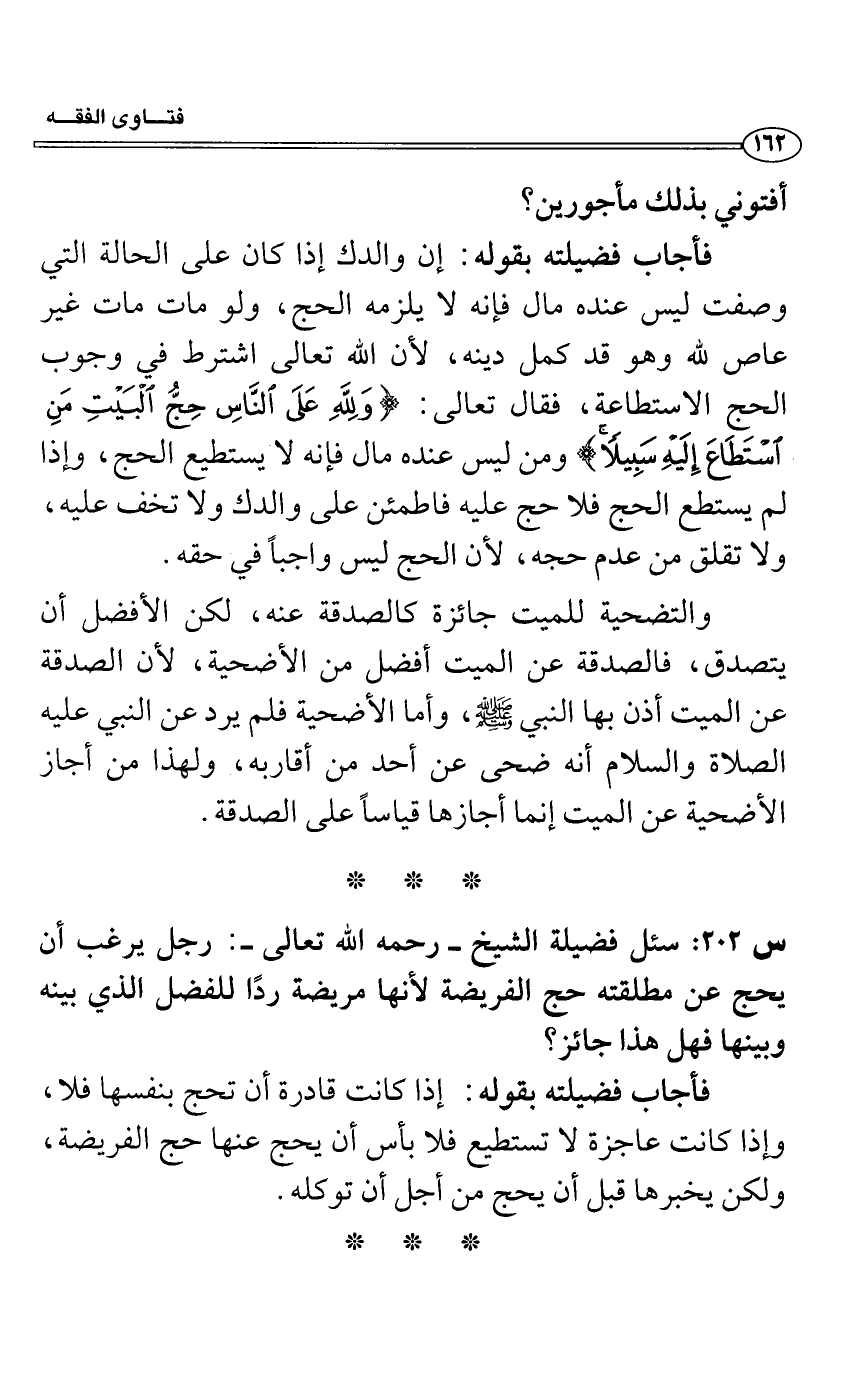 س 202: سئل فضيلة الشيخ- رحمه الله تعالى-: رجل يرغب أن يحج عن مطلقته حج الفريضة لأنها مريضة رداً للفضل الذي بينه وبينها فهل هذا جائز؟