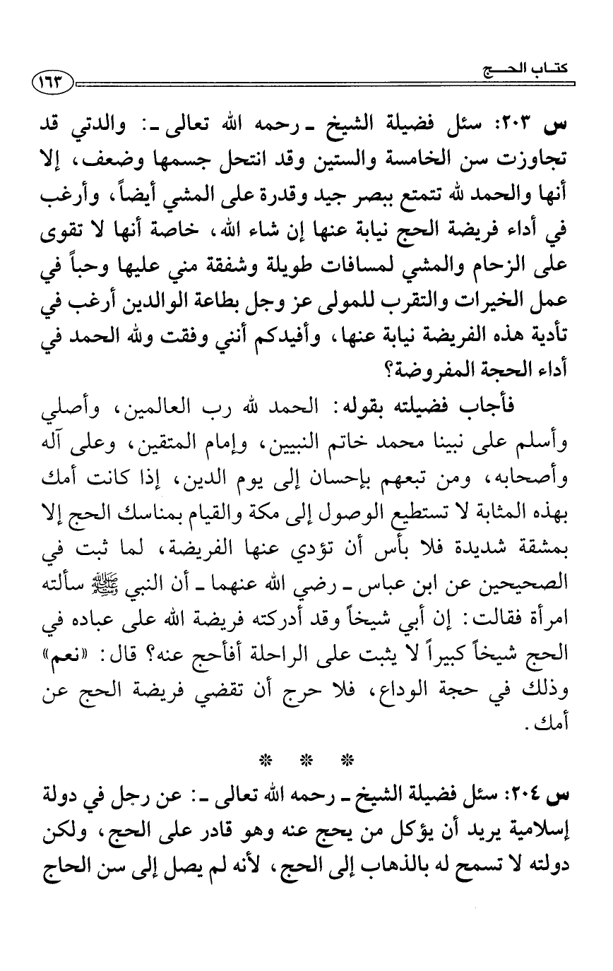 س 204: سئل فضيلة الشيخ- رحمه الله تعالى-: عن رجل في دولة إسلامية يريد أن يؤكل من يحج عنه وهو قادر على الحج، ولكن دولته لا تسمح له بالذهاب إلى الحج، لأنه لم يصل إلى سن الحاج