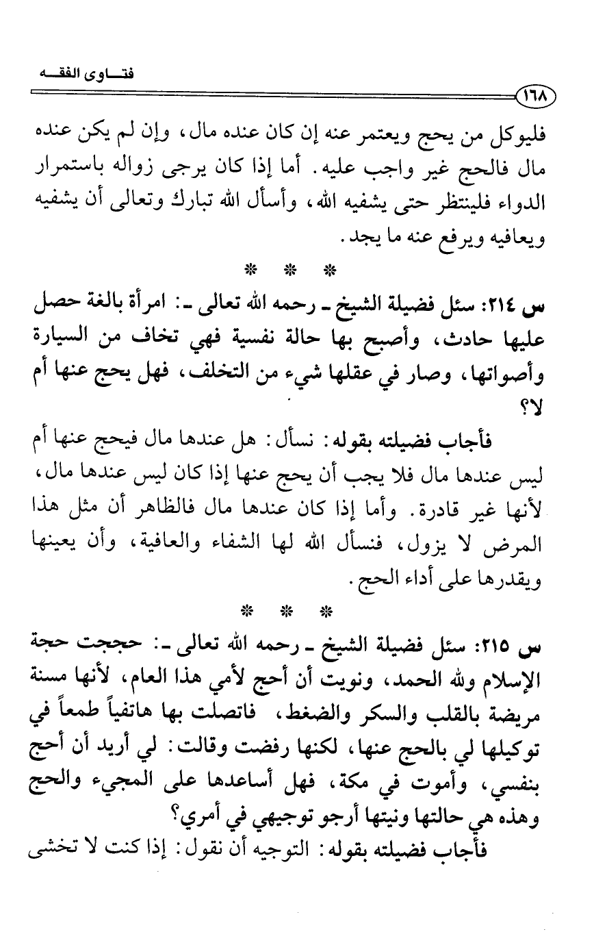 س 215: سئل فضيلة الشيخ- رحمه الله تعالى-: حججت حجة الإسلام ولله الحمد، ونويت أن أحج لأمي هذا العام، لأنها مسنة مريضة بالقلب والسكر والضغط، فاتصلت بها هاتفياً طمعاً في