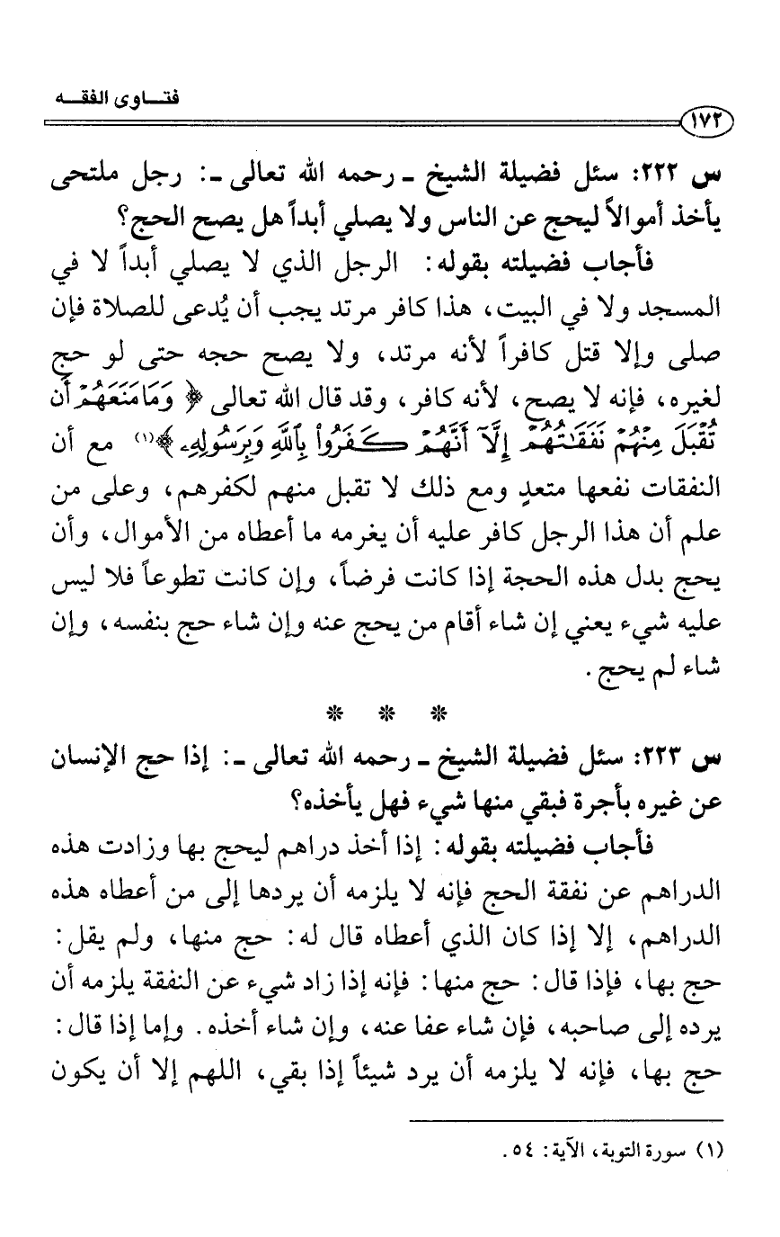 فأجاب فضيلته بقوله: الرجل الذي لا يصلي أبداً لا في المسجد ولا في البيت، هذا كافر مرتد يجب أن يدعى للصلاة فإن صلى وإلا قتل كافراً لأنه مرتد، ولا يصح حجه حتى لو حج لغيره، فإنه لا يصح، لأنه كافر، وقد قال الله تعالى (وَمَا مَنَعَهُمْ أَنْ تُقْبَلَ مِنْهُمْ نَفَقَاتُهُمْ إِلَّا أَنَّهُمْ كَفَرُوا بِاللَّهِ وَبِرَسُولِهِ) (1) مع أن النفقات نفعها متعدٍ ومع ذلك لا تقبل منهم لكفرهم، وعلى من علم أن هذا الرجل كافر عليه أن يغرمه ما أعطاه من الأموال، وأن يحج بدل هذه الحجة إذا كانت فرضاً، وإن كان تطوعاً فلا ليس عليه شيء يعني إن شاء أقام من يحج عنه إن شاء حج بنفسه، وإن شاء لم يحج.