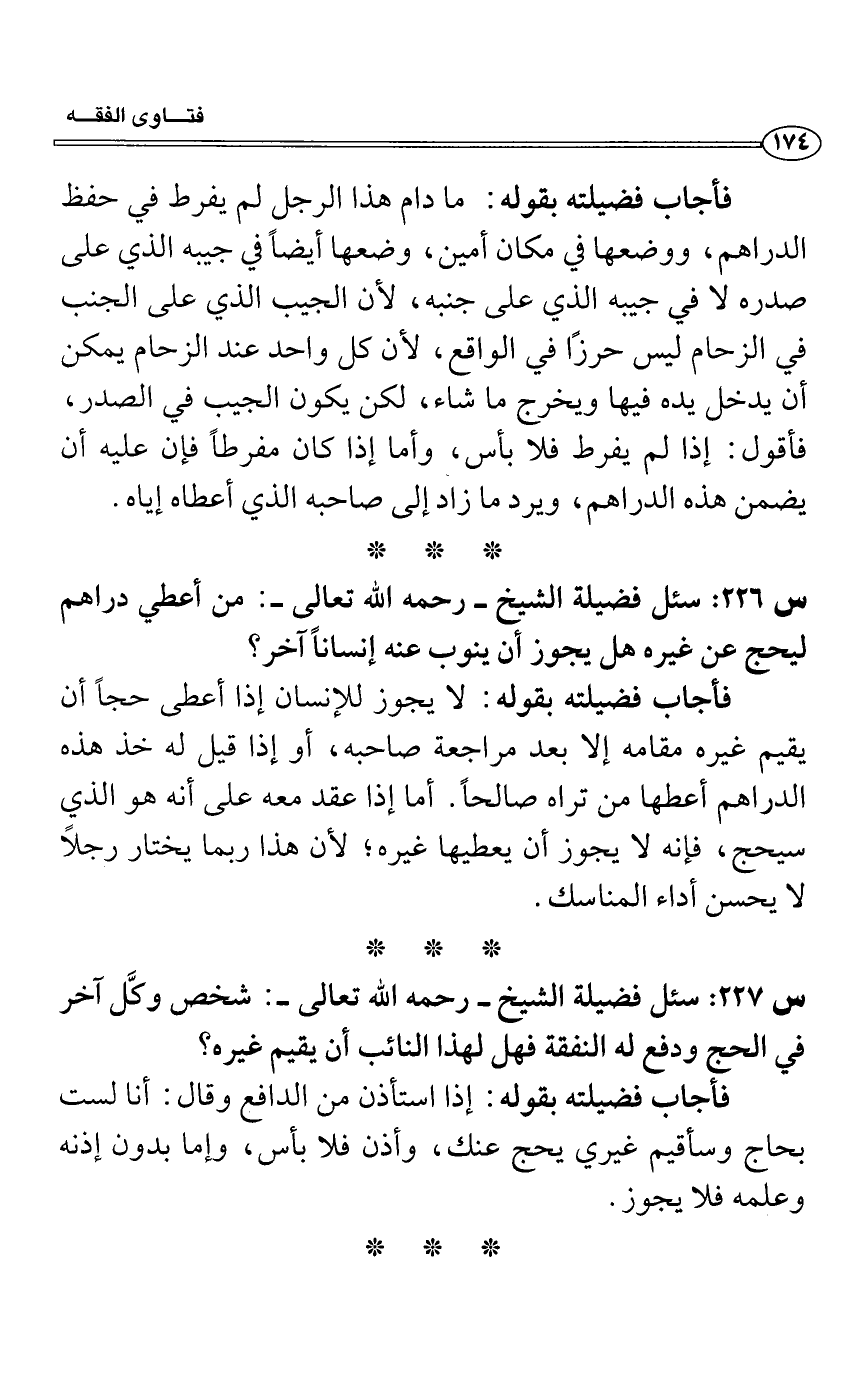 س 227: سئل فضيلة الشيخ- رحمه الله تعالى-: شخص وكَّل آخر في الحج ودفع له النفقة فهل لهذا النائب أن يقيم غيره؟