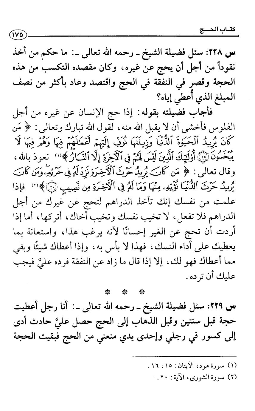س 228: سئل فضيلة الشيخ- رحمه الله تعالى-: ما حكم من أخذ نقوداً من أجل أن يحج عن غيره، وكان مقصده التكسب من هذه الحجة وقصر في النفقة في الحج واقتصد وعاد بأكثر من نصف المبلغ الذي أُعطي إياه؟