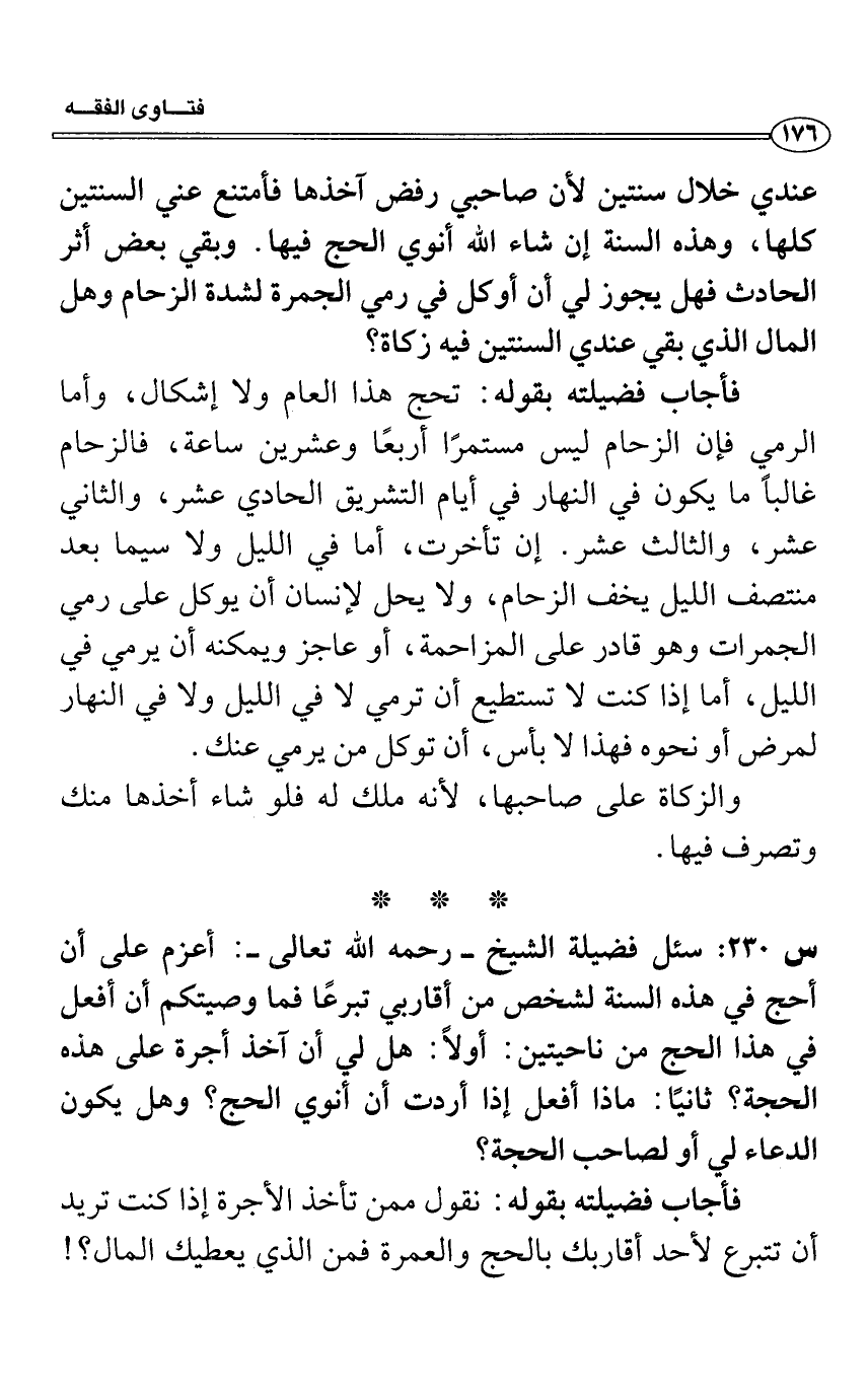 س 230: سئل فضيلة الشيخ- رحمه الله تعالى-: أعزم على أن أحج في هذه السنة لشخص من أقاربي تبرعاً فما وصيتكم أن أفعل في هذا الحج من ناحيتين: أولاً: هل لي أن آخذ أجرة على هذه