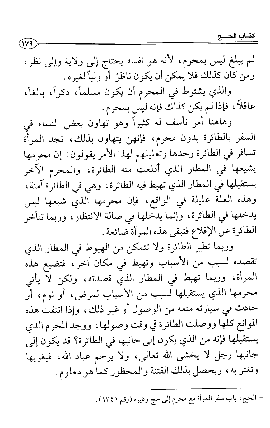 وربما تطير الطائرة ولا تتمكن من الهبوط في المطار الذي تقصده لسبب من الأسباب وتهبط في مكان آخر، فتضيع هذه المرأة، وربما تهبط في المطار الذي قصدته، ولكن لا يأتي محرمها الذي يستقبلها لسبب من الأسباب لمرض، أو نوم، أو حادث في سيارته منعه من الوصول أو غير ذلك، وإذا انتفت هذه الموانع كلها ووصلت الطائرة في وقت وصولها، ووجد المحرم الذي يستقبلها فإنه من الذي يكون إلى جانبها في الطائرة؟ قد يكون إلى جانبها رجل لا يخشى الله تعالى، ولا يرحم عباد الله، فيغريها وتغتر به، ويحصل بذلك الفتنة والمحظور كما هو معلوم.