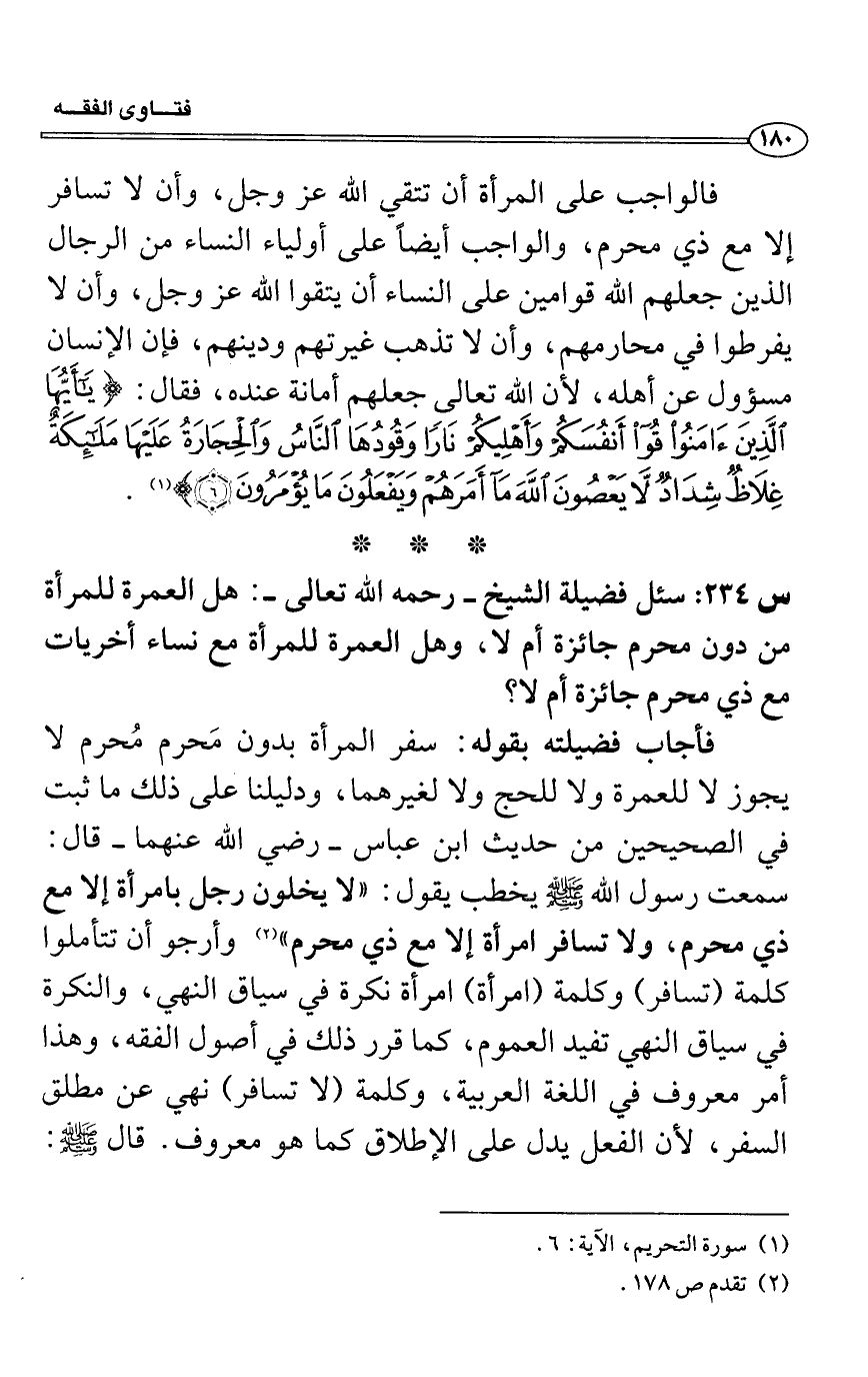 س 234: سئل فضيلة الشيخ- رحمه اله تعالى-: هل العمرة للمرأة من دون محرم جائزة أم لا، وهل العمرة للمرأة مع نساء أخريات مع ذي محرم جائزة أم لا؟