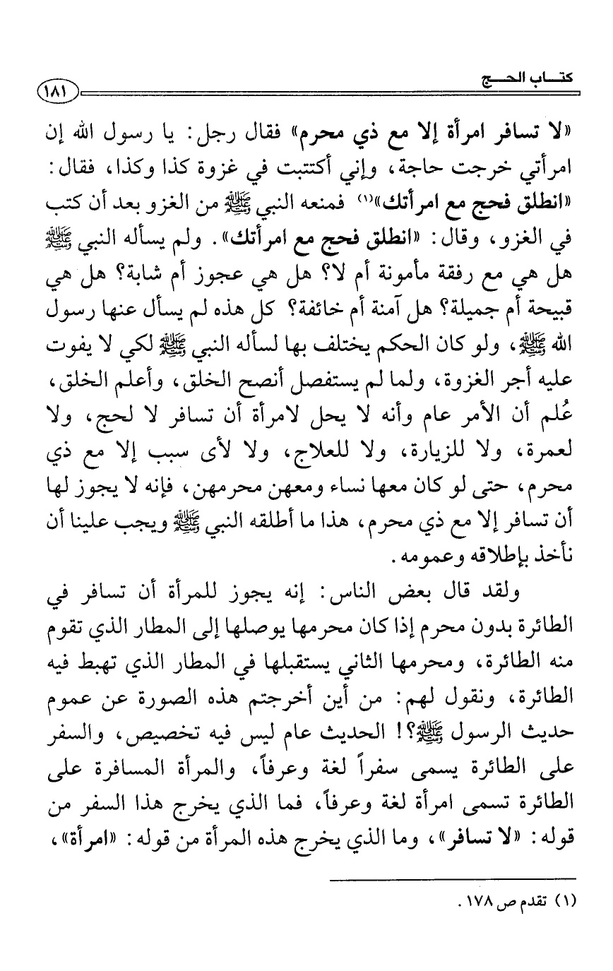ولقد قال بعض الناس: إنه يجوز للمرأة أن تسافر في الطائرة بدون محرم إذا كان محرمها يوصلها إلى المطار الذي تقوم منه الطائرة، ومحرمها الثاني يستقبلها في المطار الذي تهبط فيه الطائرة، ونقول لهم: من أين أخرجتم هذه الصورة عن عموم حديث الرسول - صلى الله عليه وسلم -؟! الحديث عام ليس فيه تخصيص، والسفر على الطائرة يسمى سفراً لغة وعرفاً، والمرأة المسافرة على الطائرة تسمى امرأة لغة وعرفاً، فما الذي يخرج هذا السفر من قوله: "لا تسافر "، وما الذي يخرج هذه المرأة من قوله: "امرأة"،