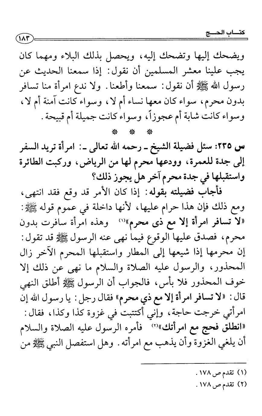 س 235: سئل فضيلة الشيخ- رحمه الله تعالى-: امرأة تريد السفر إلى جدة للعمرة، وودعها محرم لها من الرياض، وركبت الطائرة واستقبلها في جدة محرم آخر هل يجوز ذلك؟