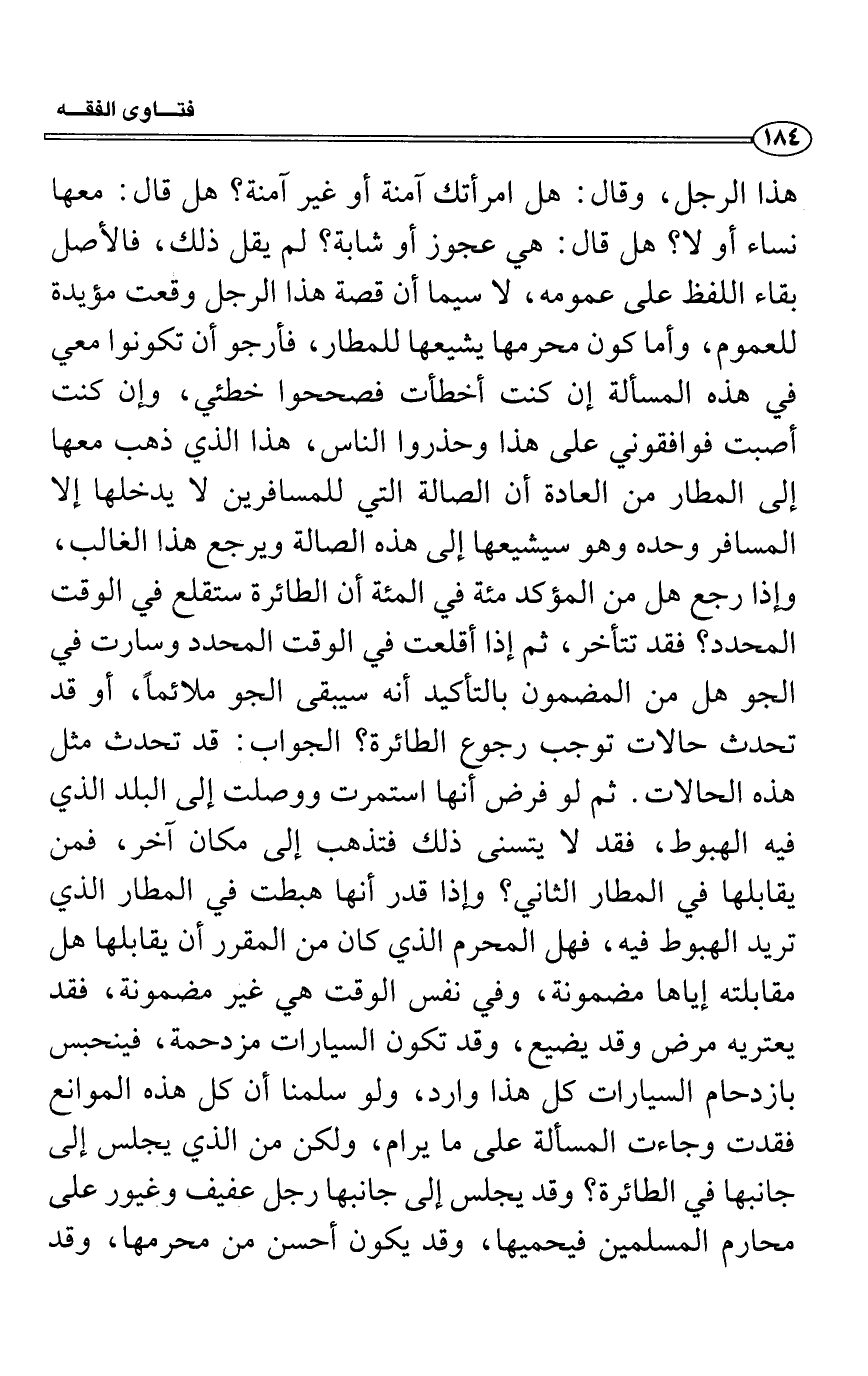 إلى المطار من العادة أن الصالة التي للمسافرين لا يدخلها إلا المسافر وحده وهو سيشيعها إلى هذه الصالة ويرجع هذا الغالب، وإذا رجع هل من المؤكد مئة في المئة أن الطائرة ستقلع في الوقت المحدد؟ فقد تتأخر، ثم إذا أقلعت في الوقت المحدد وسارت في الجو هل من المضمون بالتأكيد أنه سيبقى الجو ملائماً، أو قد تحدث حالات توجب رجوع الطائرة؟ الجواب: قد تحدث مثل هذه الحالات. ثم لو فرض أنها استمرت ووصلت إلى البلد الذي فيه الهبوط، فقد لا يتسنى ذلك فتذهب إلى مكان آخر، فمن يقابلها في المطار الثاني؟ وإذا قدر أنها هبطت في المطار الذي تريد الهبوط فيه، فهل المحرم الذي كان من المقرر أن يقابلها هل مقابلته إياها مضمونة، وفي نفس الوقت هي غير مضمونة، فقد