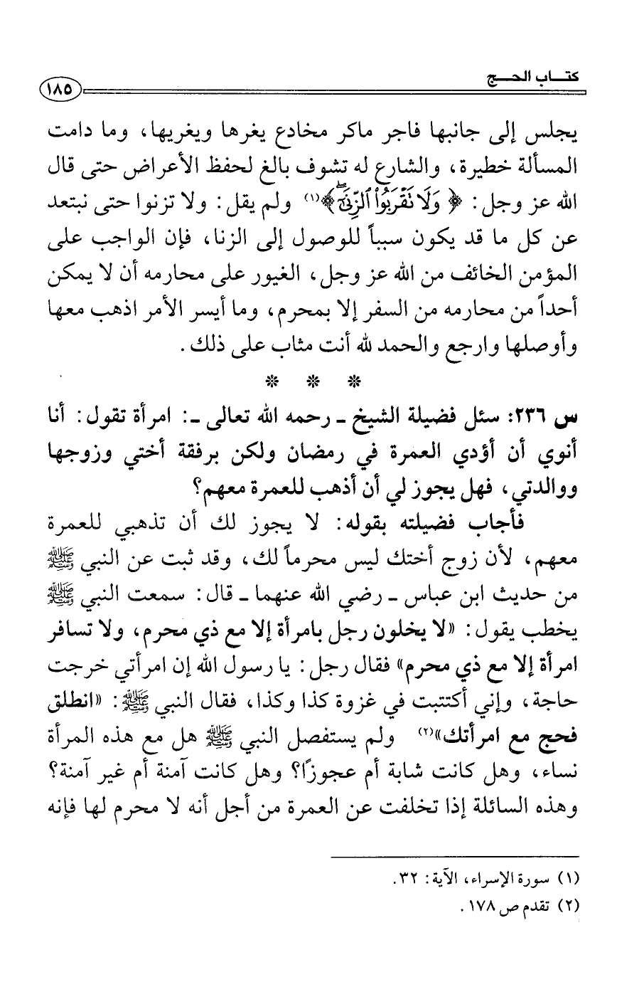 س 236: سئل فضيلة الشيخ- رحمه الله تعالى-: امرأ تقول: أنا أنوي أن أؤدي العمرة في رمضان ولكن برفقة أختي وزوجها ووالدتي، فهل يجوز لي أن أذهب للعمرة معهم؟