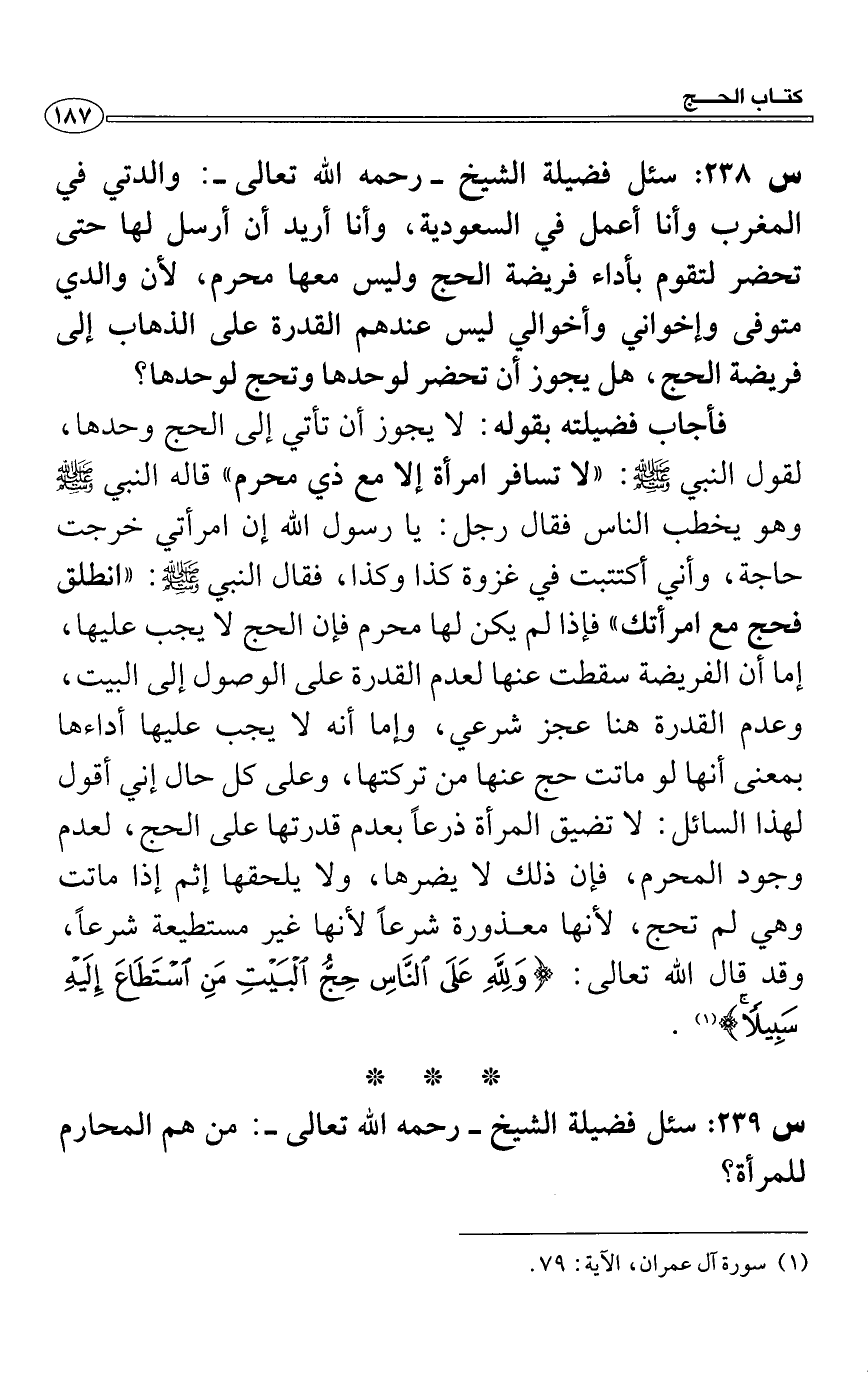 فأجاب فضيلته بقوله: لا يجوز أن تأتي إلى الحج وحدها، لقول النبي - صلى الله عليه وسلم -: "لا تسافر امرأة إلا مع ذي محرم " قاله النبي - صلى الله عليه وسلم - وهو يخطب الناس فقال رجل: يا رسول الله إن امرأتي خرجت حاجة، وأني أكتتبت في غزوة كذا وكذا، فقال النبي - صلى الله عليه وسلم -: "انطلق فحج مع امرأتك " فإذا لم يكن لها محرم فإن الحج لا يجب عليها، إما أن الفريضة سقطت عنها لعدم القدرة على الوصول إلى البيت، وعدم القدرة هنا عجز شرعي، وإما أنه لا حما عليها أداءها بمعنى أنها لو ماتت حج عنها من تركتها، وعلى كل حال إني أقول لهذا السائل: لا تضيق المرأة ذرعاً بعدم قدرتها على الحج، لعدم وجود المحرم، فإن ذلك لا يضرها، ولا يلحقها إثم إذا ماتت وهي لم تحج، لأنها معذورة شرعاً لأنها غير مستطيعة شرعاً، وقد قال الله تعالى: (وَلِلَّهِ عَلَى النَّاسِ حِجُّ الْبَيْتِ مَنِ اسْتَطَاعَ إِلَيْهِ سَبِيلًا) (1) .